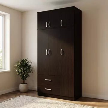 Includes three doors; the interior features a hanging rail and shelves, while the lower section includes two large drawers for storing clothes and accessories.