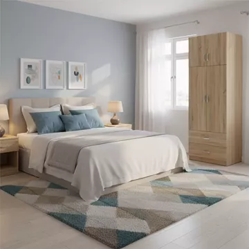 Features two doors, with an interior hanging rail, and two large drawers at the bottom for storing clothes and accessories.