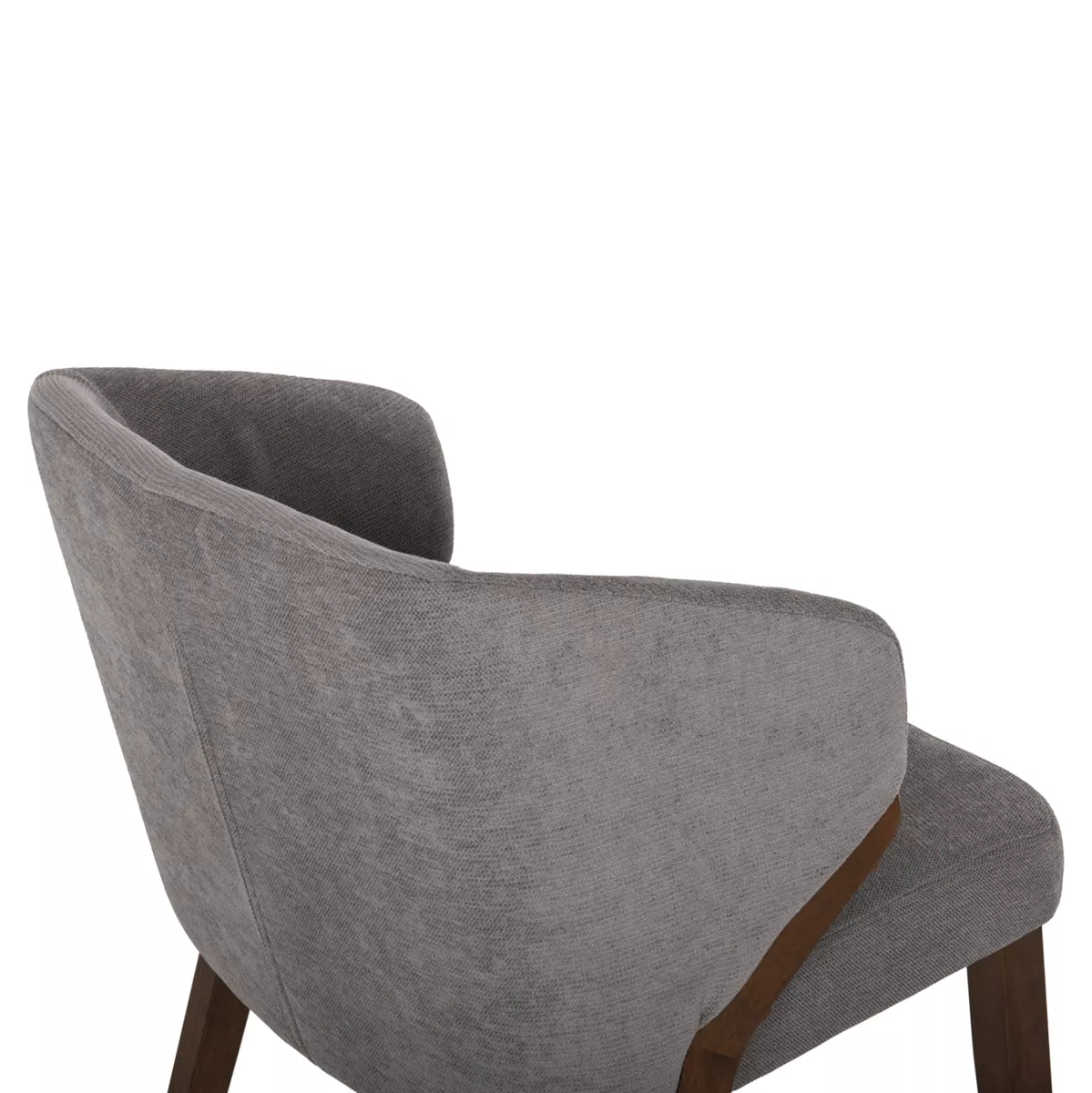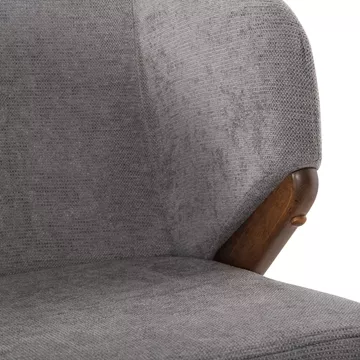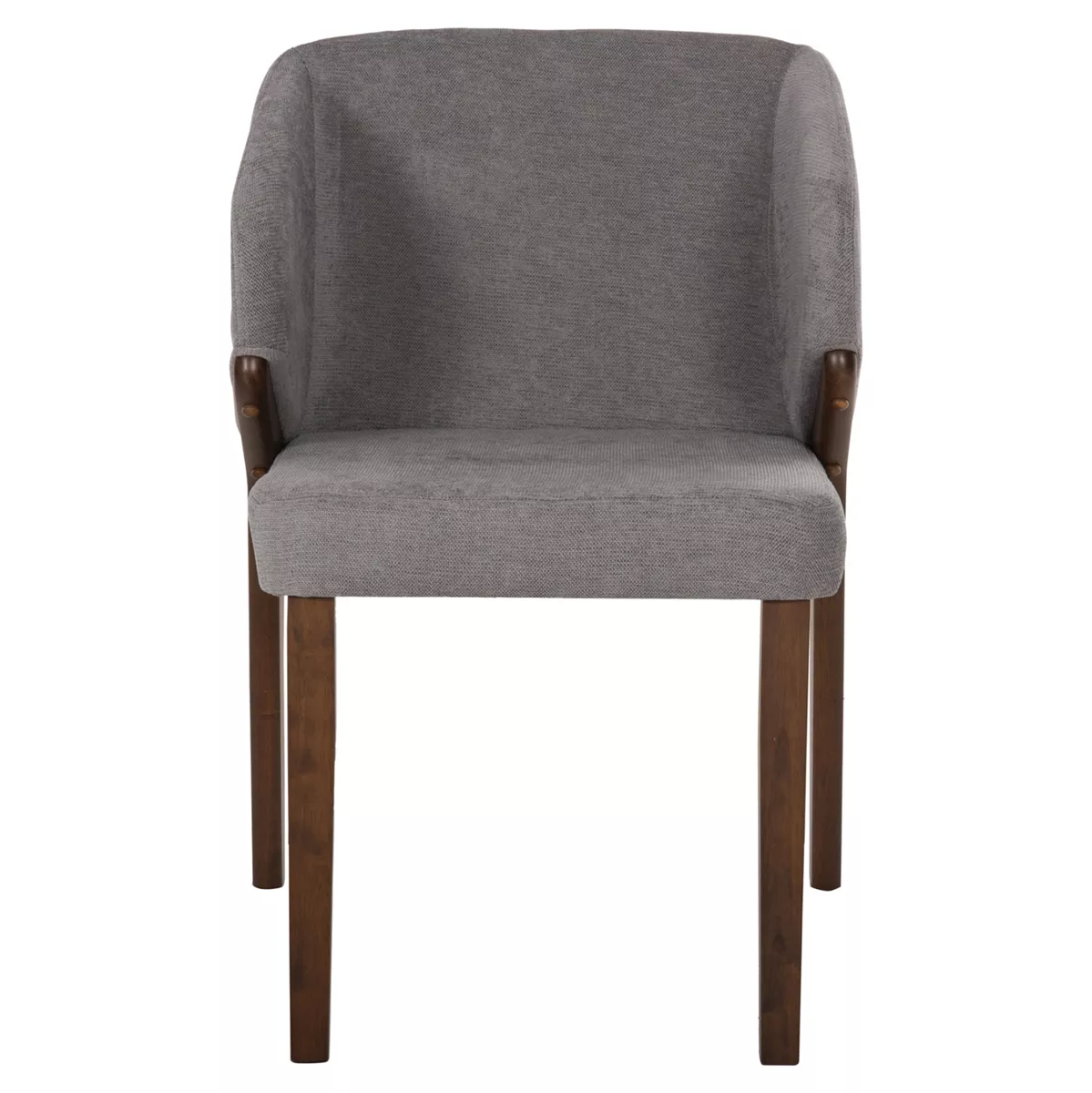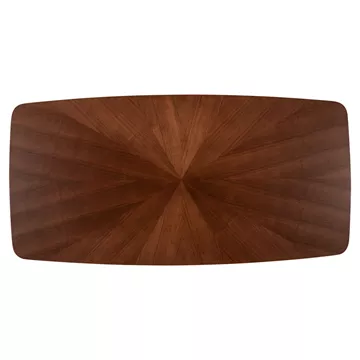 A rectangular dining table with rounded corners with a special feature that the shade of the beveled tabletop and the legs/bases is DARK WALNUT in a sunburst style of veneer, and 6 dining chairs made of quality solid rubberwood in WALNUT color with comfortable squared backs that hug the body upholstered with quality GREY fabric.