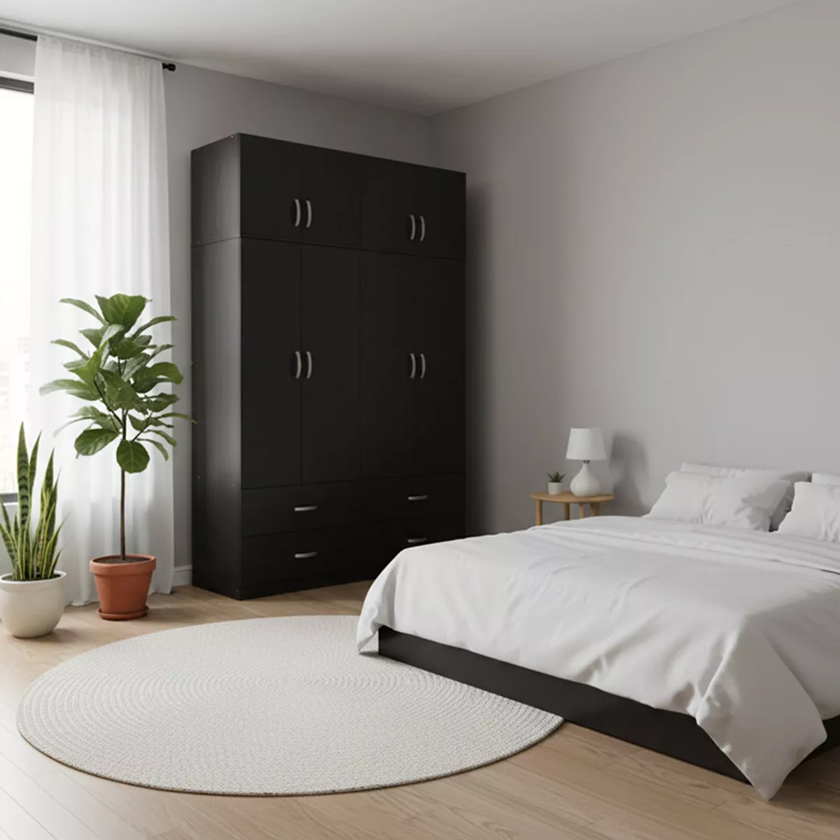 • Features four doors; the interior includes a hanging rail for clothes, while the lower section has two large drawers for storing clothing and accessories. With the addition of the overhead cabinet, it provides extra storage for clothing, linens, and seasonal items.