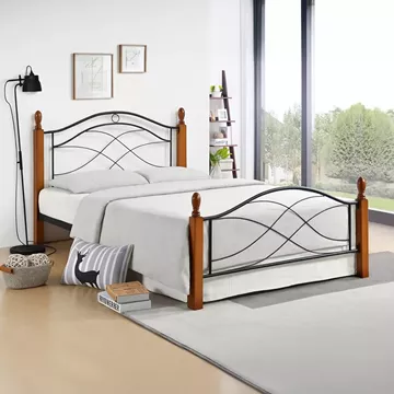 Αναβαθμίστε την κρεβατοκάμαρά σας με αυτό το μοντέρνο και κομψό μονό κρεβάτι, ιδανικό για να προσδώσει μια νότα φινέτσας και ζεστασιάς στον χώρο σας. Η στιβαρή μεταλλική κατασκευή σε μαύρο χρώμα, διακοσμημένη με ένα περίτεχνο σχέδιο στο κεφαλάρι και στο ποδαρικό, συνδυάζεται αρμονικά με τις εκλεπτυσμένες ξύλινες κολώνες σε ζεστό καρυδί τόνο.