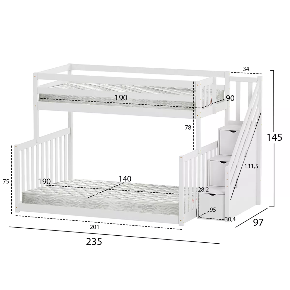 Mattress dimensions (upper): 90x190 cm.------ Mattress height: 19 cm.