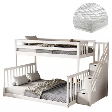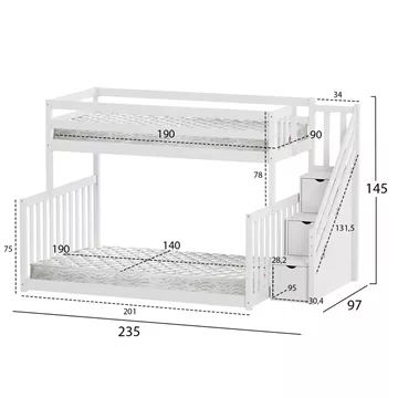 The BEAMER children's bunk bed in a size for mattresses of 90 and 140x190cm, is made of pine wood in WHITE color. The upper bed is accessed via a practical side ladder, while the lower bed is wider and sits directly on the floor. The mattresses are placed on plywood boards.