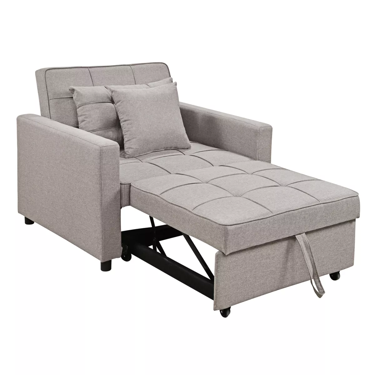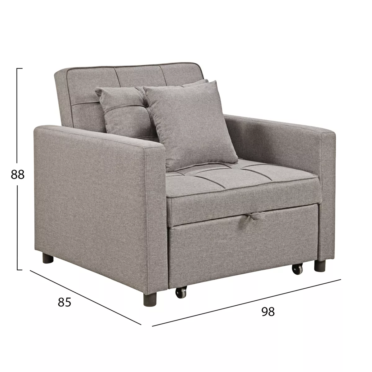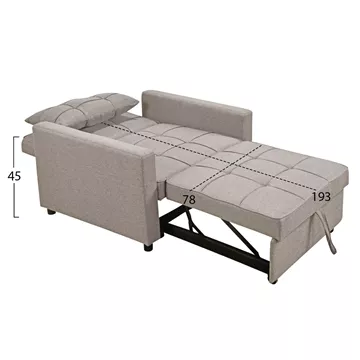 The MERO armchair-bed combines comfort, practicality and flexibility. Upholstered in BEIGE fabric, it incorporates a sliding, retractable bed with a strap and wheels, which is raised via a special mechanism when unfolding. The backrest offers two options for use, as it can either remain upright or “fall”, depending on the desired resting position.