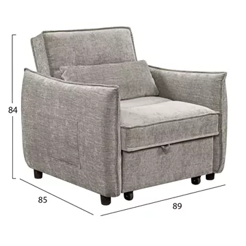 The ORYN armchair-bed combines comfort, practicality and flexibility. Upholstered in BEIGE fabric, it incorporates a sliding, retractable bed with a strap and wheels, which is raised via a special mechanism when unfolding. The backrest offers two options for use, as it can either remain upright or “fall”, depending on the desired resting position, while on the outer side of the armrests there is a pocket for placing various objects.