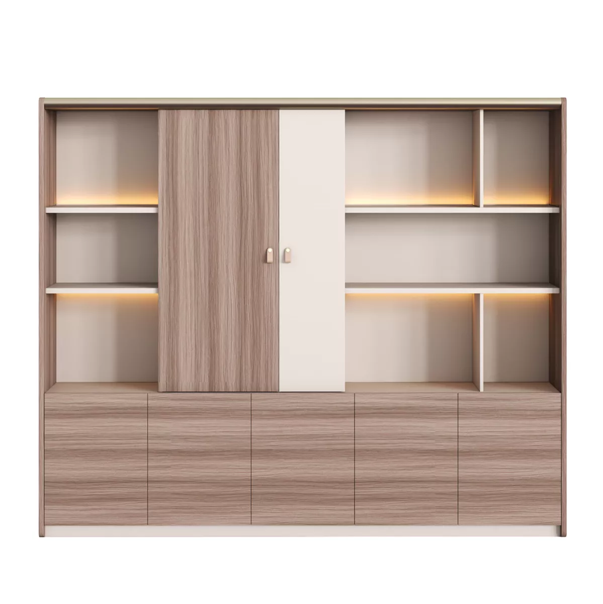 The SUPERON office bookcase is a complete and elegant storage solution for modern business spaces. Its design is based on a two-tone natural wood and beige melamine, offering a balance between warmth and modern aesthetics.