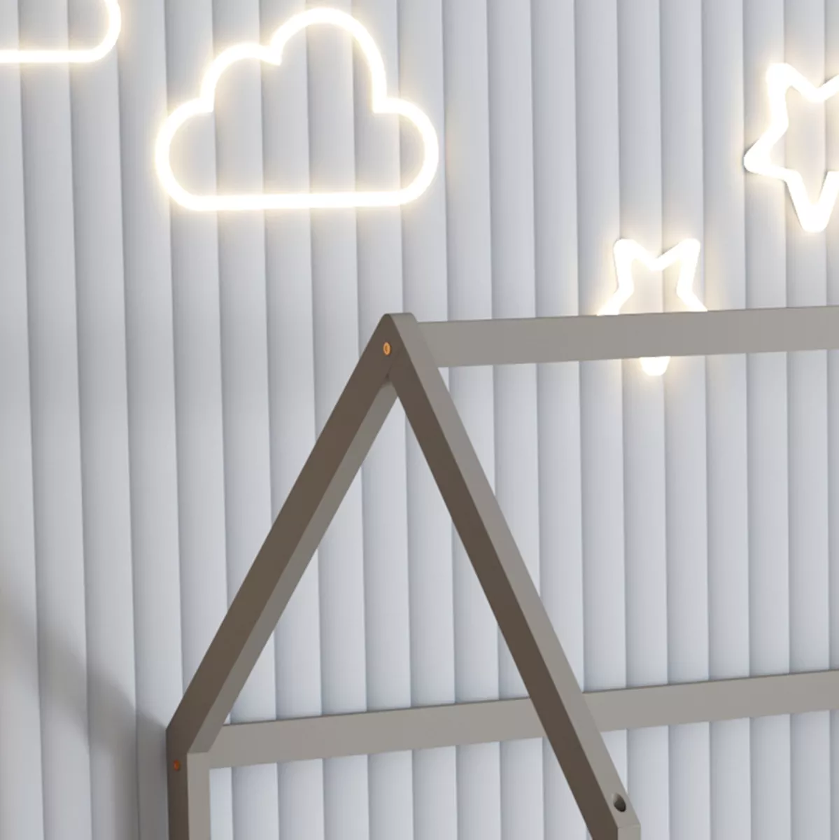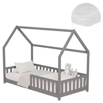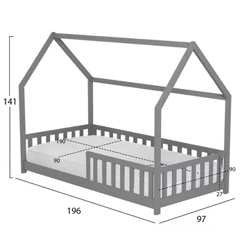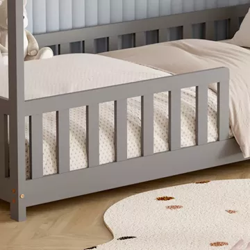 The PHYLLIS Montessori-type children's bed in dimensions for a mattress of 90x190cm, is made of pine wood in GREY color. The whole bed is shaped like a house with extremely low legs and features wooden railing around the perimeter, while the mattress is placed on plywood boards.