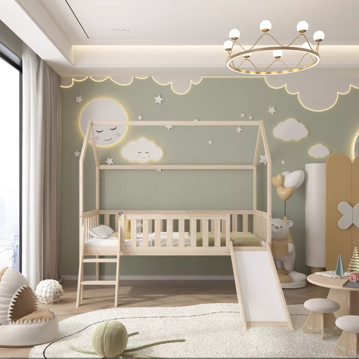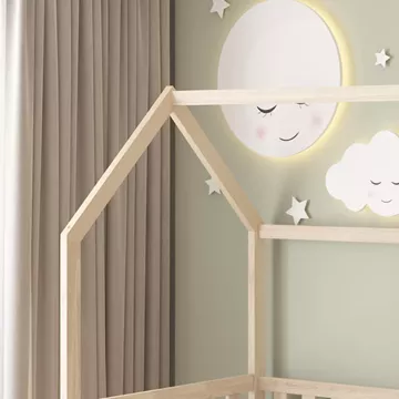 The PHYLLIS Montessori-type children's bed in dimensions for a mattress of 90x190cm, is made of pine wood in NATURAL color. The entire bed is raised and has the shape of a house, but what makes children love it is that it has a slide, offering endless hours of play and joy. Access to the bed is via a small ladder, also serving the purpose of the slide, while the mattress is placed on plywood boards.