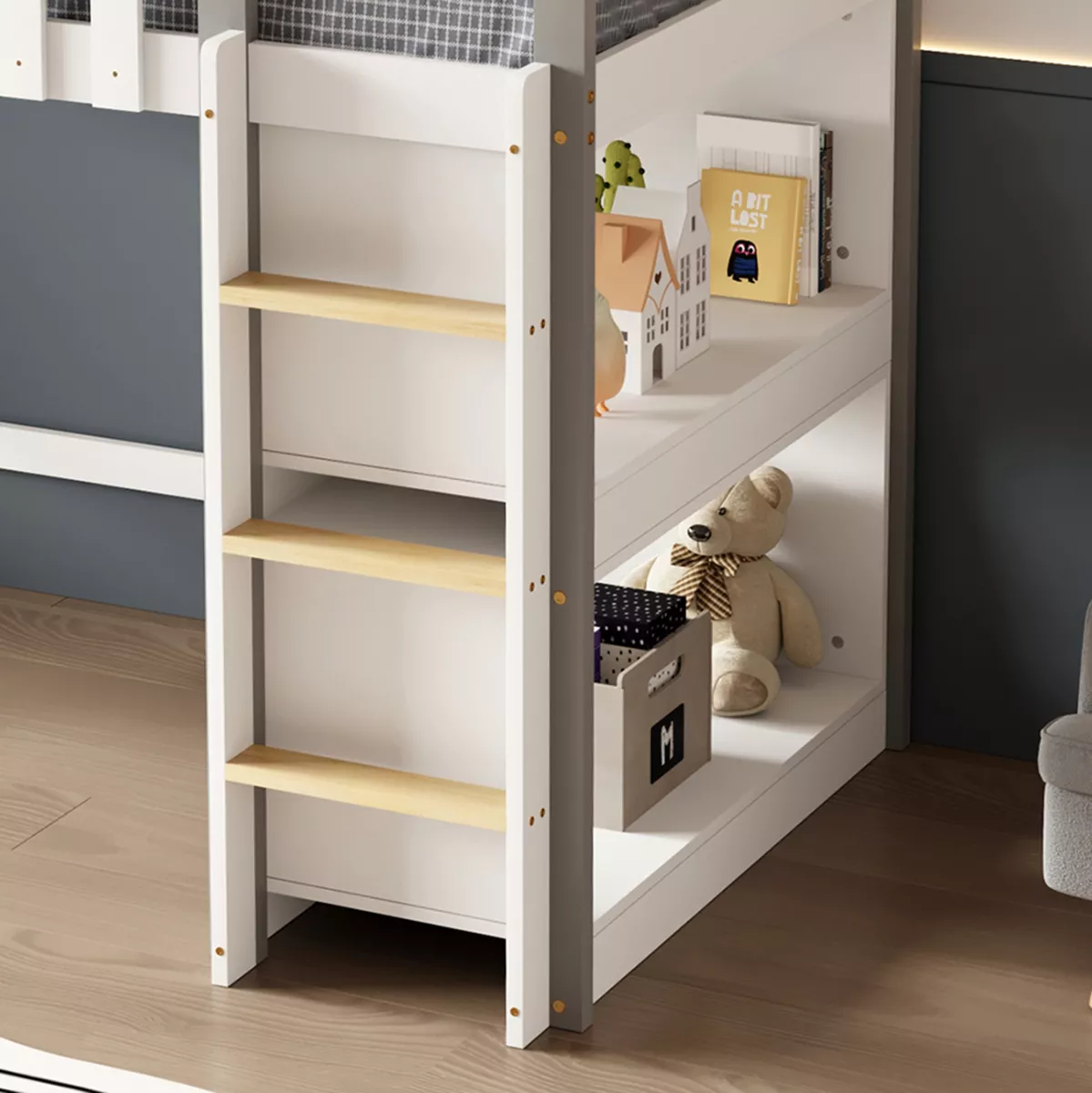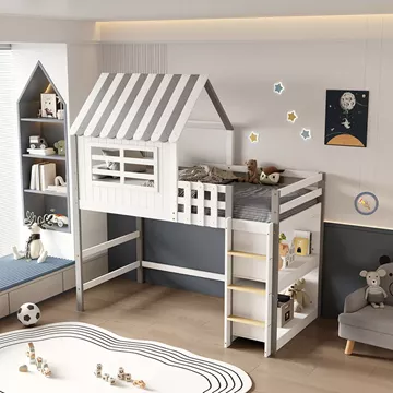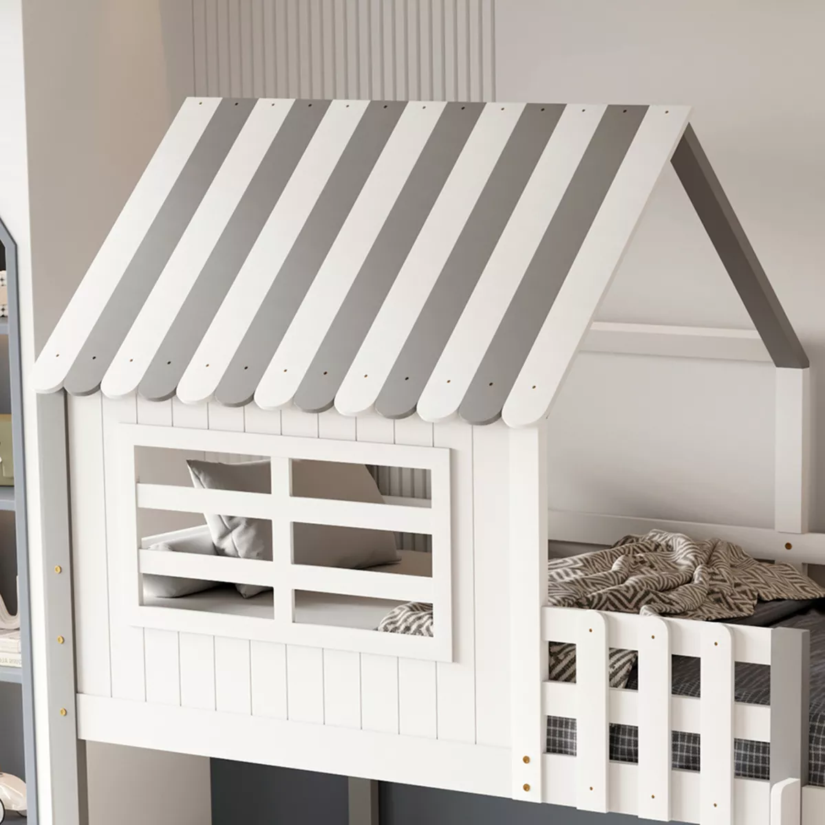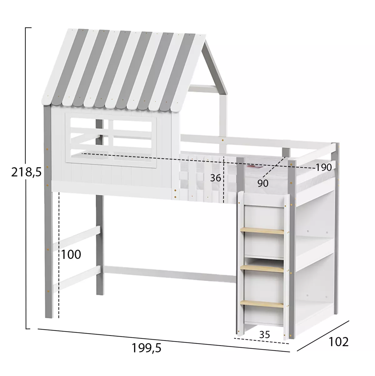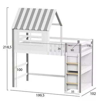 The HOMI children's bunk bed in a size for mattress of 90x190cm, is made of pine wood in WHITE/GREY color. The bunk bed, shaped like a little house with a window, features perimeter railings on the upper bed and a vertical access ladder, while the mattress is placed on plywood boards. The bottom is empty (giving you the opportunity to use the space as you wish) with two shelves placed on the right side behind the ladder.