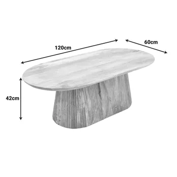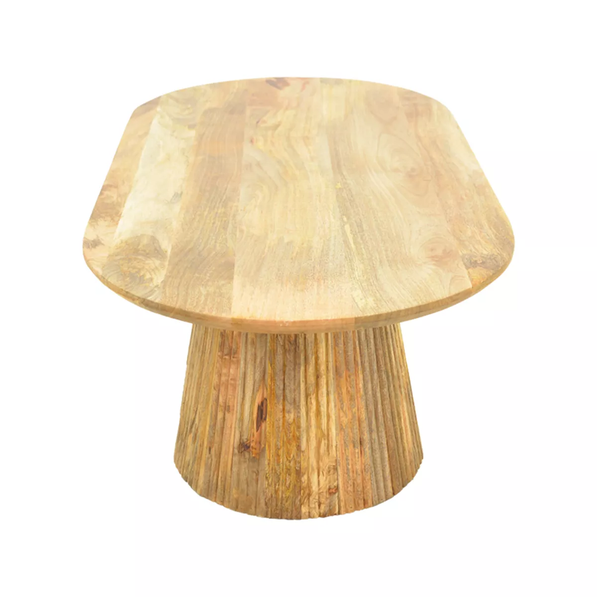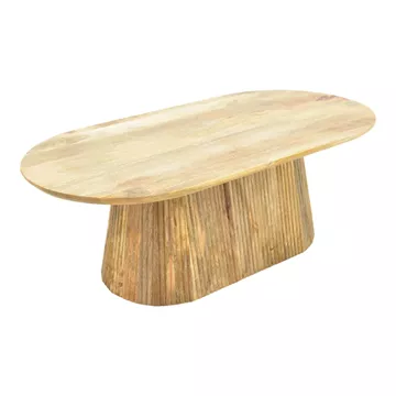Aithra coffee table made of solid mango wood, featuring a modern design and natural aesthetic. Its oval tabletop highlights the unique texture and grain of the wood, adding warmth and elegance to any interior.