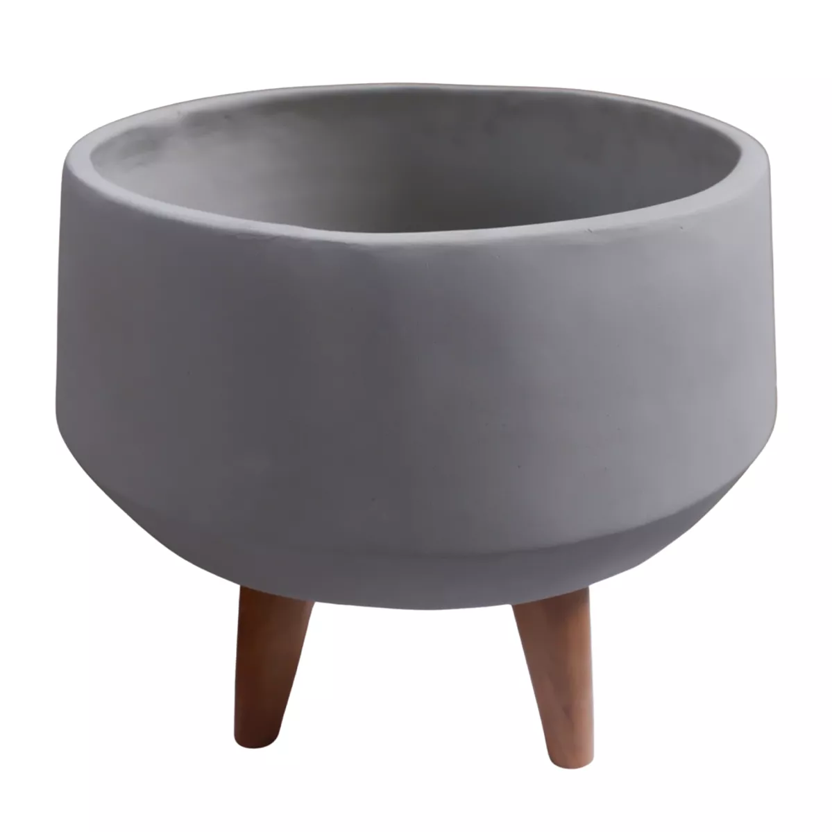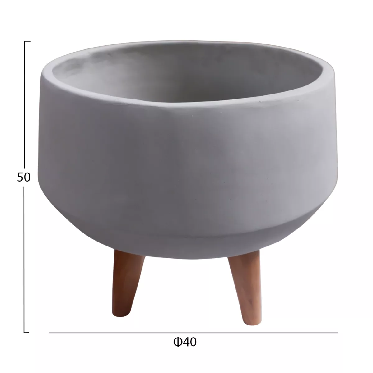 The wide and shallow indoor pot (casing-style) QUAN is made of Fiber Cement in GREY color. Its special feature is that it is accompanied and placed on a relatively tall tripod base made of teak wood. To use it, it is recommended to place an inner container to properly maintain the pot.