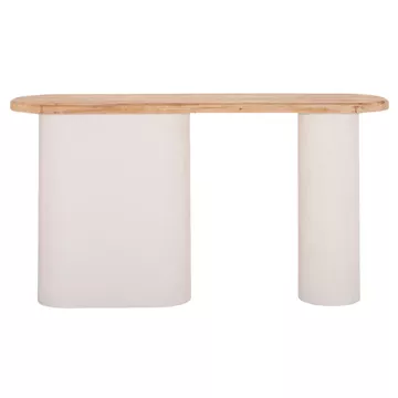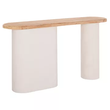 The SANTORINI console is a unique piece of contemporary design that balances natural aesthetics and modern architectural form. Its oval surface in combination with the two differently shaped bases create a dynamic, sculptural presence that stands out in any space. The NATURAL shade of the fir wood and the OFF-WHITE grain texture of the legs create an elegant combination that is reminiscent of a minimal Mediterranean aesthetic.
