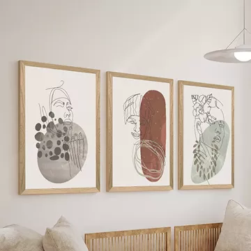 Create a wall with personality using this set of three panels. The collection features abstract female faces sculpted with a single line, set against a backdrop of earthy blotches and natural patterns. It is an ode to contemporary femininity and style.