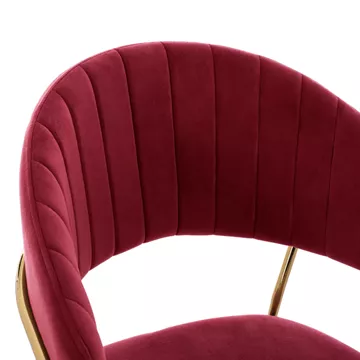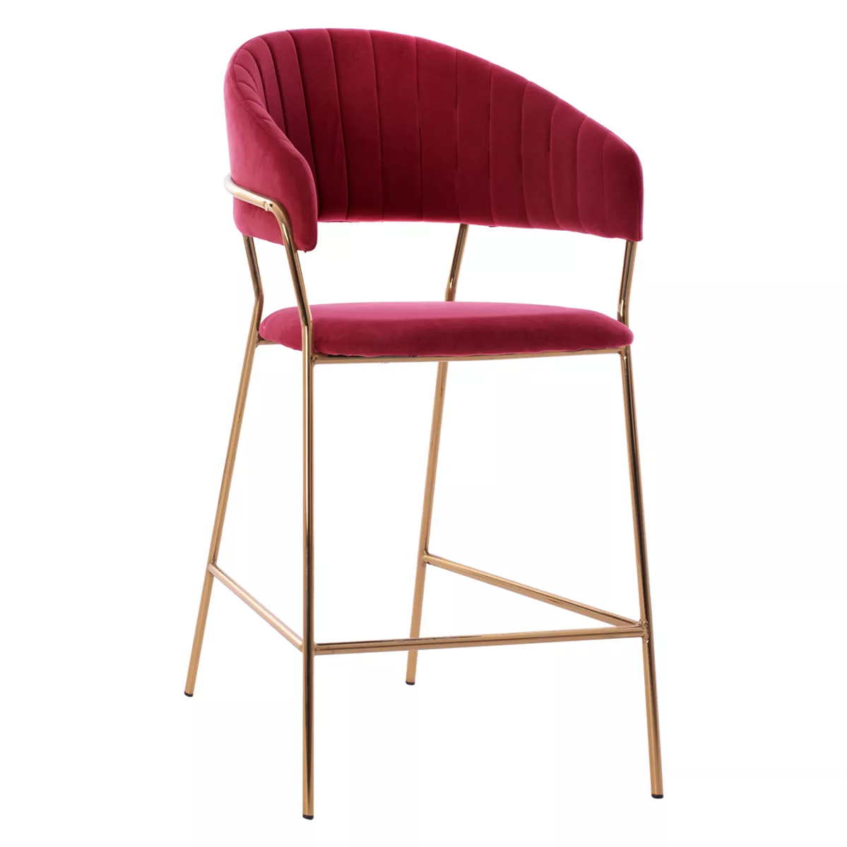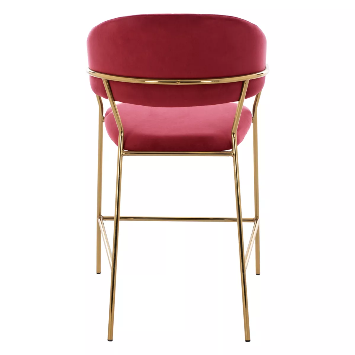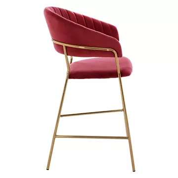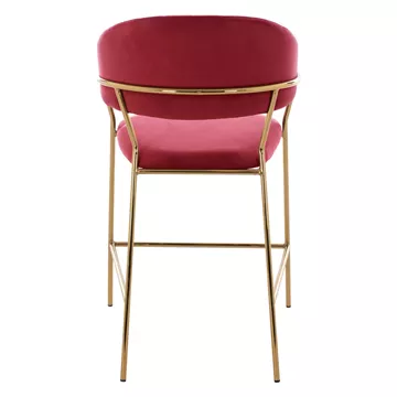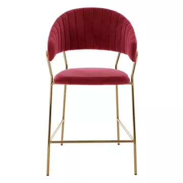 Meet THEODORE. A BURGUNDY RED velvet fabric bar stool, that has everything you would want from such a piece of furniture. THEODORE is simple and elegant in appearance and is sure to catch the eye. It is of medium height with a semi-circular back, and the GOLDEN metal frame ends in 4 legs which are joined by a metal rod in front and on the sides. This rod serves as a "step" to rest the feet on, giving more comfort to the stool. The seat is comfortable, and this stool is sure to be the center of attention wherever it is placed.