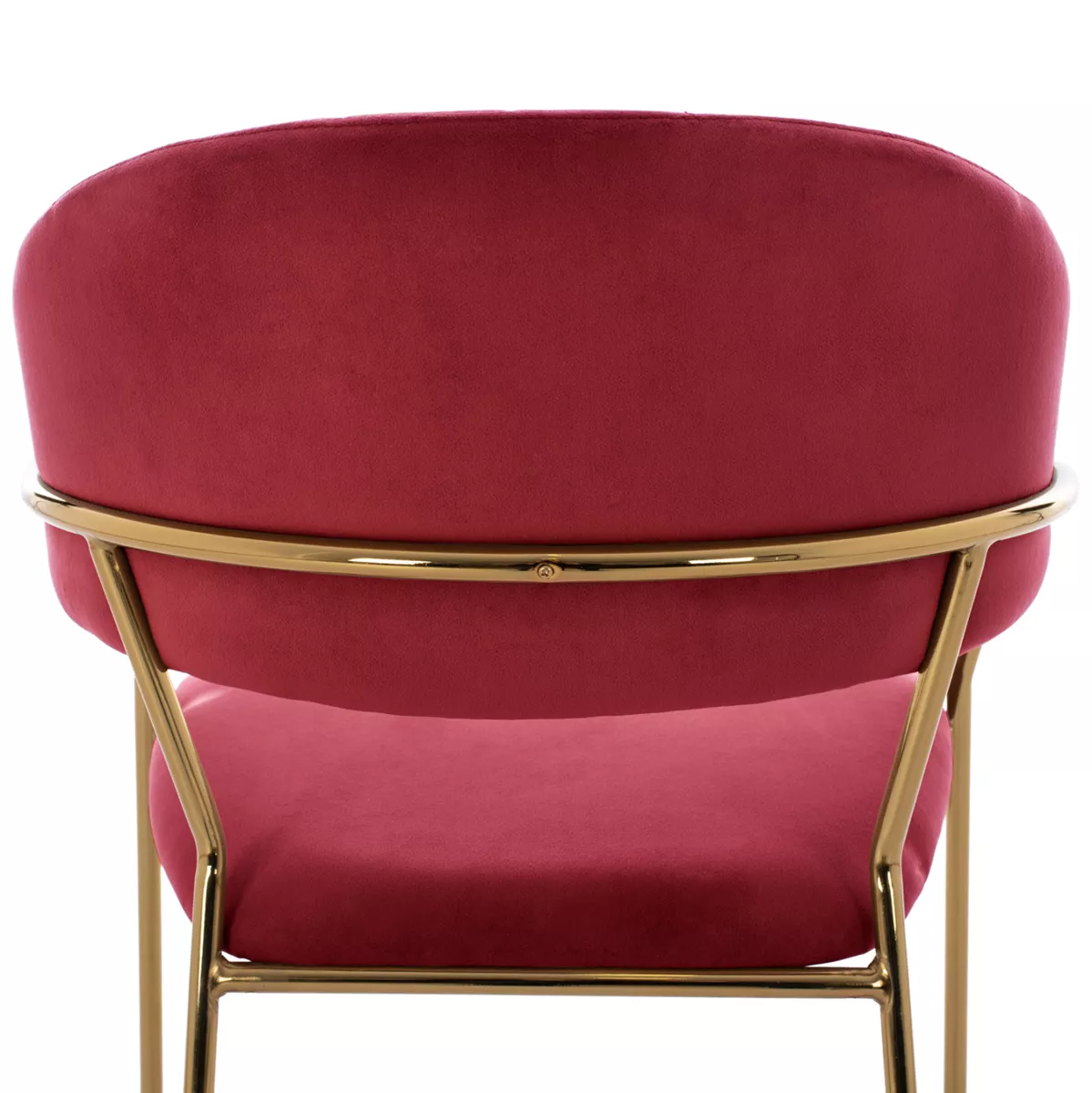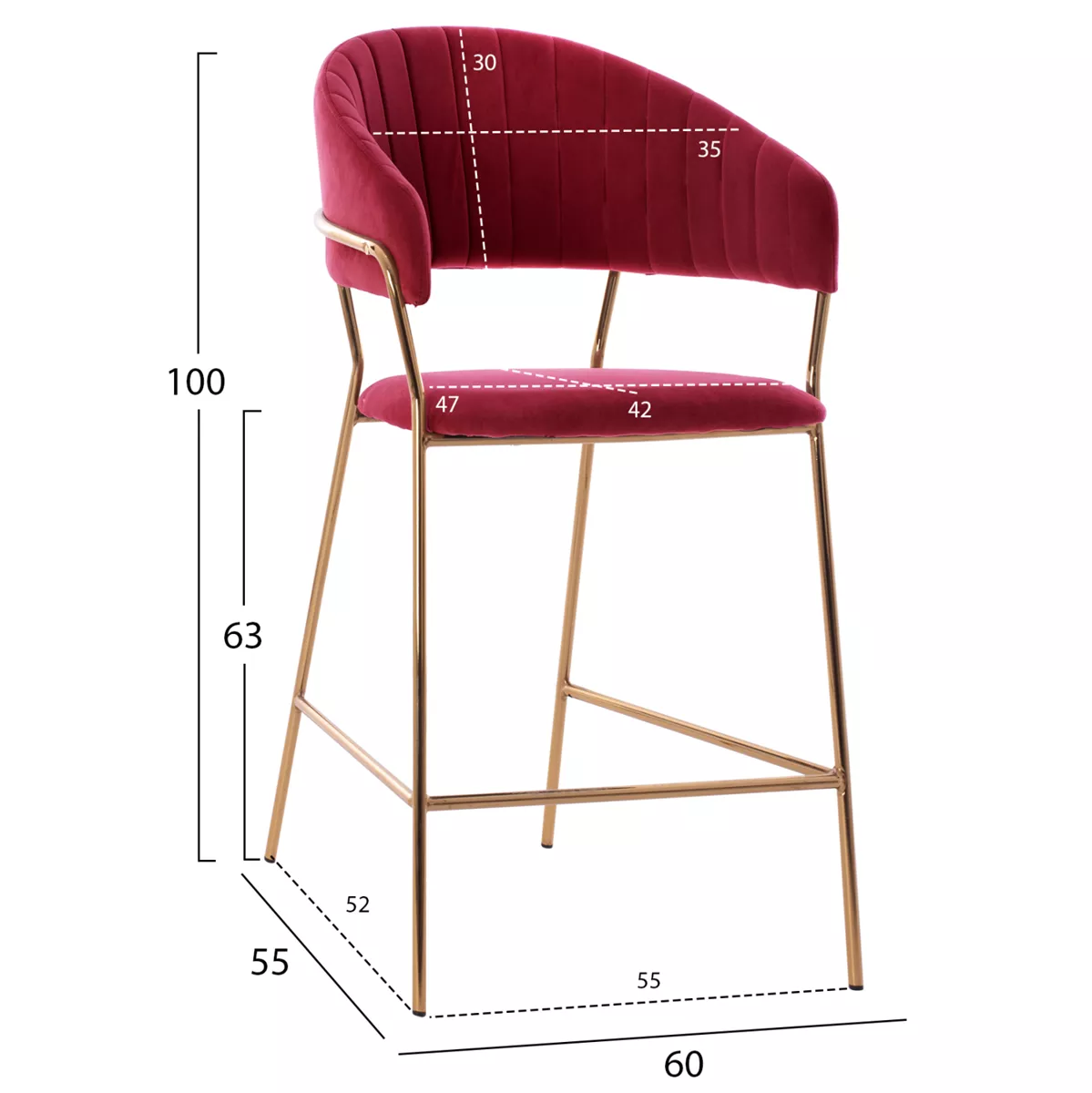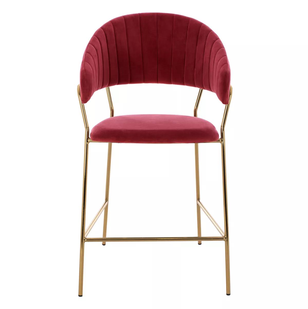 Meet THEODORE. A BURGUNDY RED velvet fabric bar stool, that has everything you would want from such a piece of furniture. THEODORE is simple and elegant in appearance and is sure to catch the eye. It is of medium height with a semi-circular back, and the GOLDEN metal frame ends in 4 legs which are joined by a metal rod in front and on the sides. This rod serves as a "step" to rest the feet on, giving more comfort to the stool. The seat is comfortable, and this stool is sure to be the center of attention wherever it is placed.