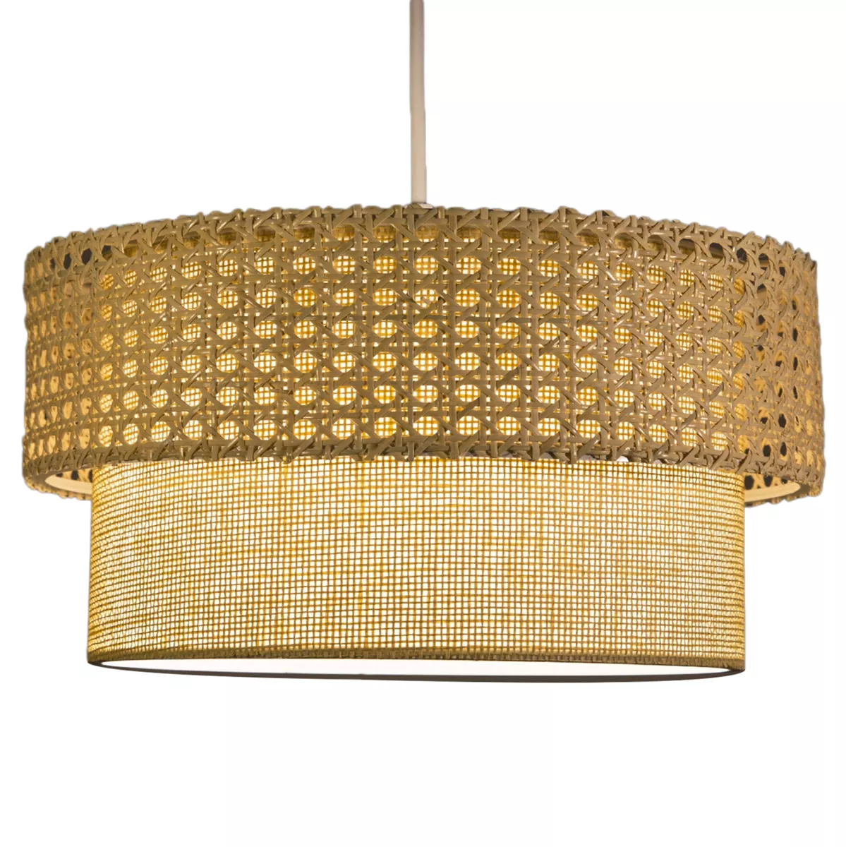 CONSTRUCTION MATERIAL: The "drums" of the luminaire are made of fabric and knitted rattan, while the frame is made of laser-cut electrostatic metal, offering durability and ease of cleaning.