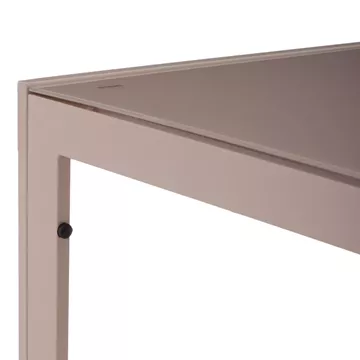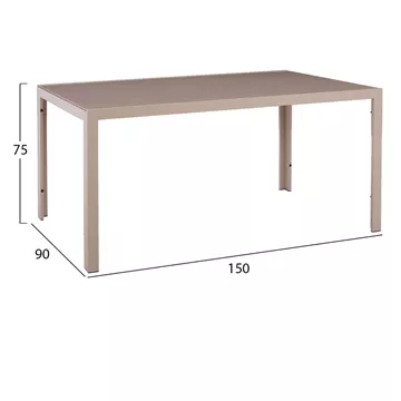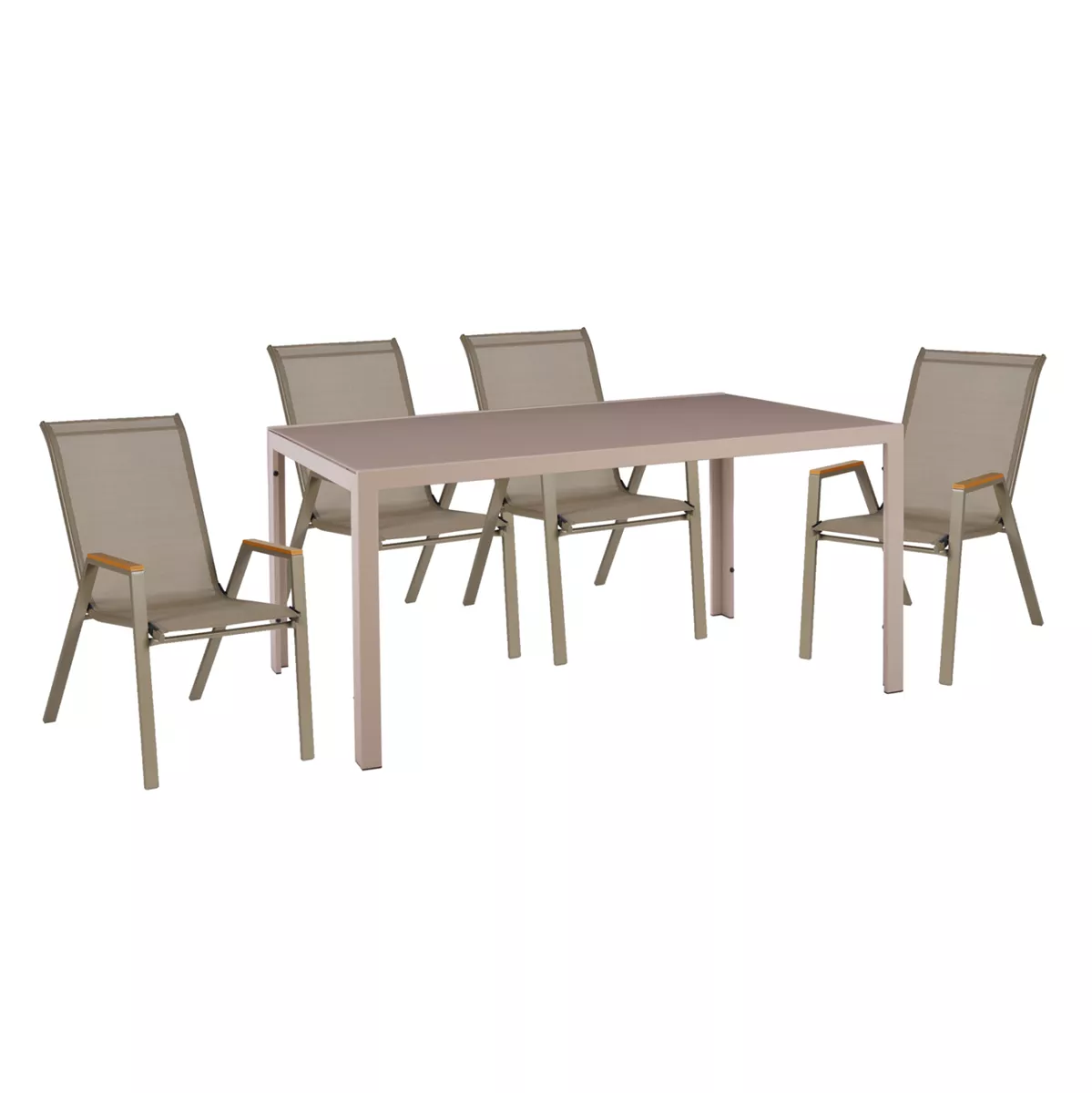 This outdoor dining set features a table with a CAPPUCCINO colored metal frame and surface, while the top also features safety glass, and 4 champagne-colored metal armchairs (stackable) with a seat & back made of textilene fabric in CHAMPAGNE, with wooden upholstery on the armrests.