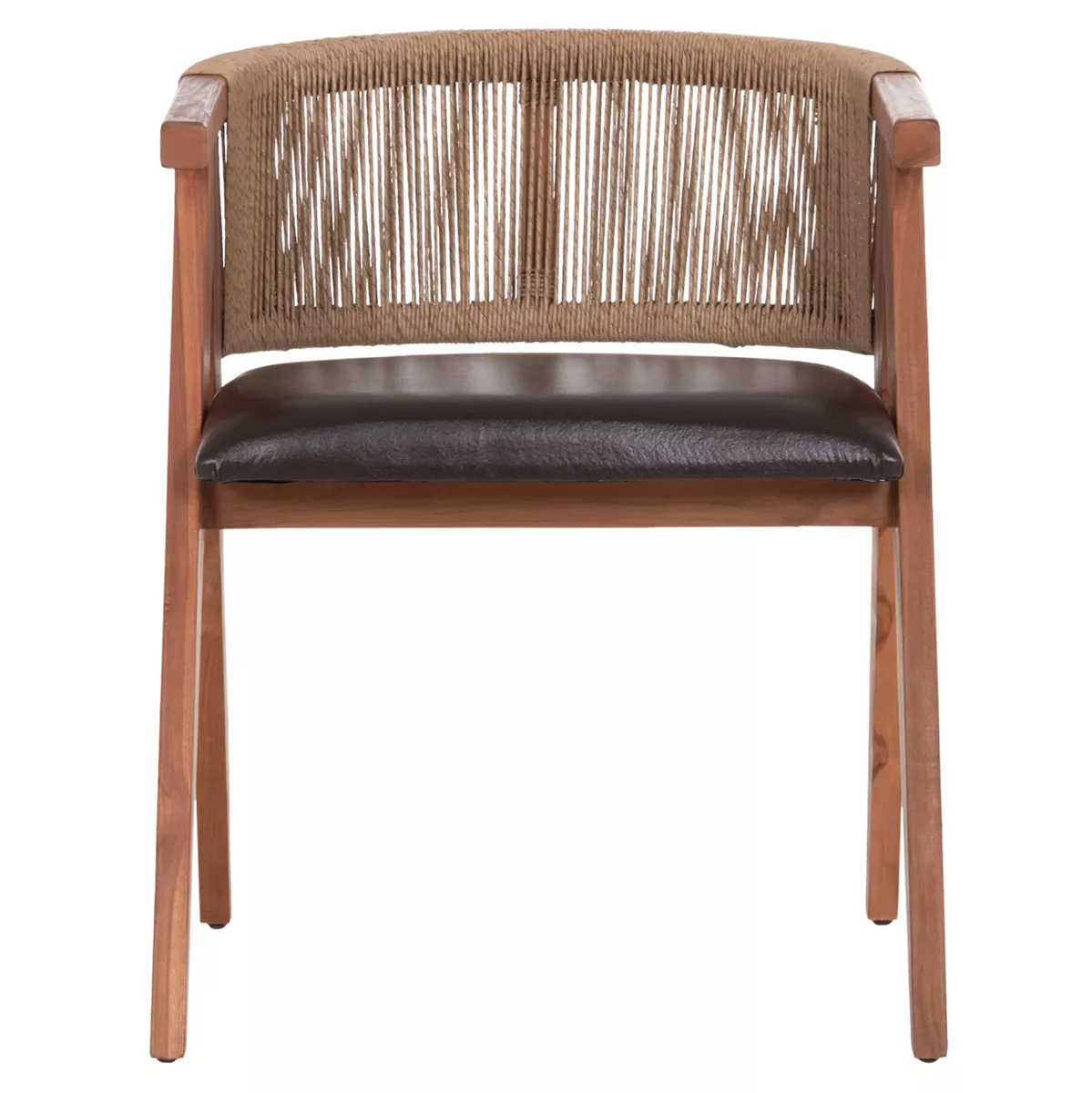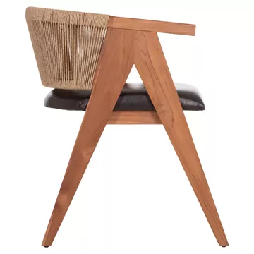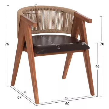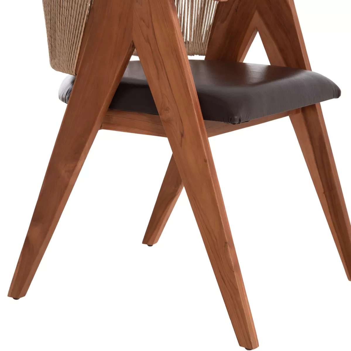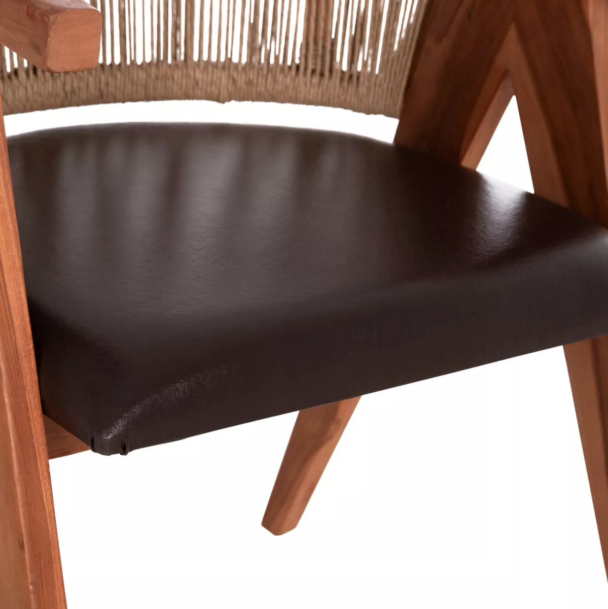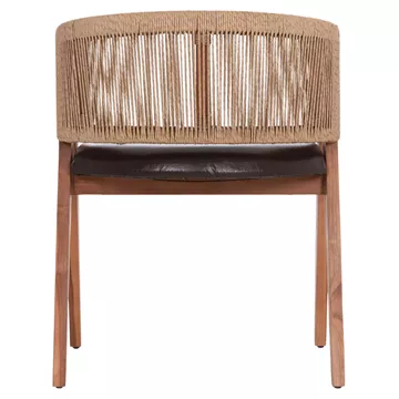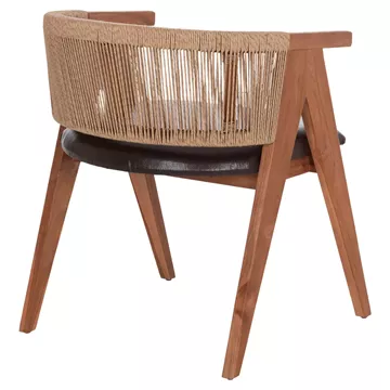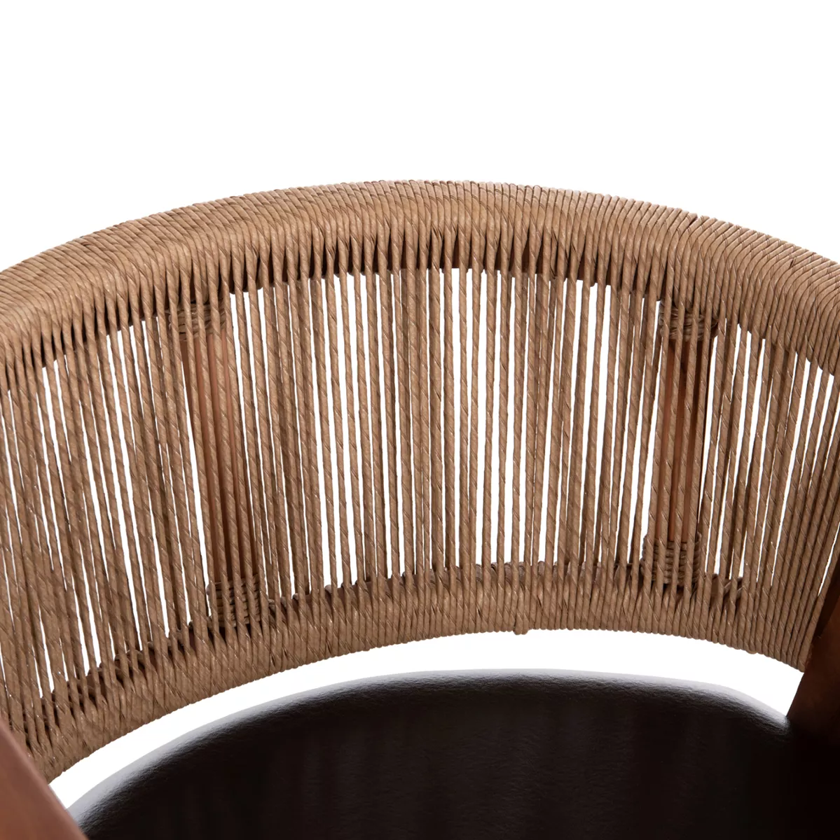 BRANN is a premium dining chair that combines natural materials with modern aesthetics, creating a piece with a strong personality. The solid teak wood frame offers excellent durability and stability. The semicircular synthetic rope backrest hugs the body and gives a feeling of lightness and elegance. The seat upholstered in brown PU leather adds warmth, comfort and timeless character.