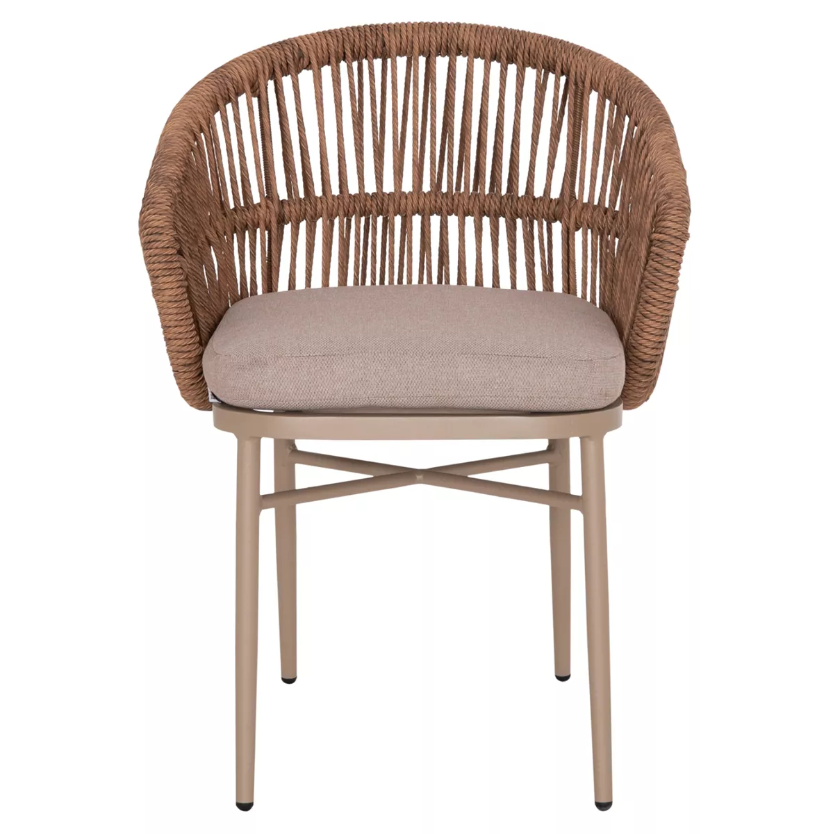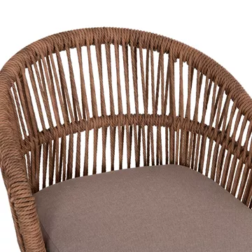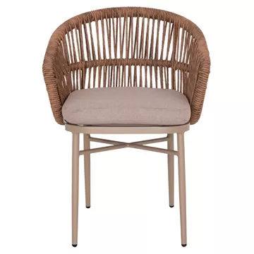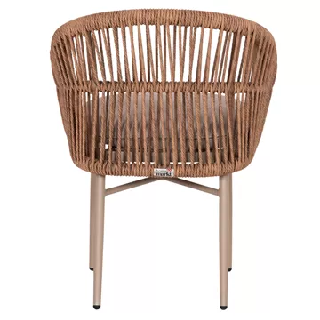 The aluminum dining chair ORIN, both for professional use and for home use, has a curved back with wickerwork from P.E. Rattan in NATURAL color, while the frame is in CAPPUCCINO color. The seat has a cushion with quality fabric in similar color. It is also STACKABLE, which makes it particularly practical for a variety of uses.