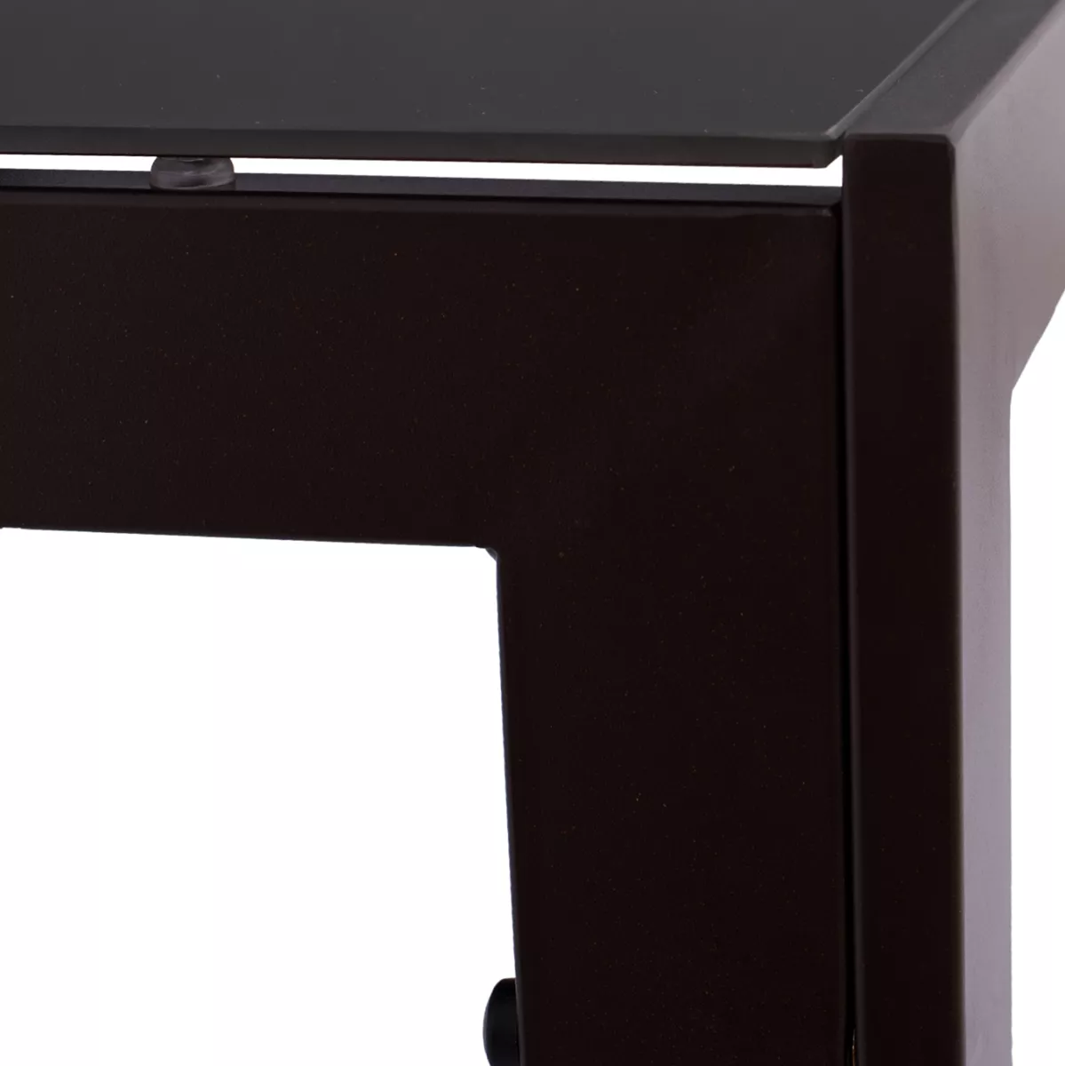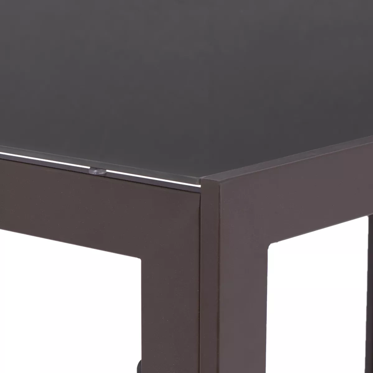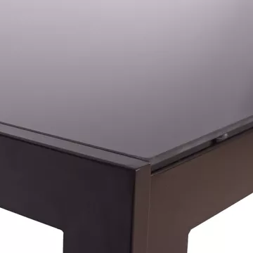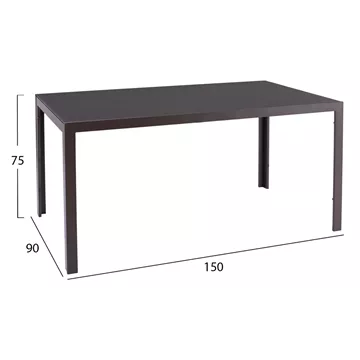 This outdoor dining set features a table with a BROWN metal frame and surface, while the top also features safety glass, and 4 brown metal armchairs with comfortable cushions upholstered in BEIGE fabric, with zippers. The cushion is 8cm thick and is tied to the armchair with discreet cords.