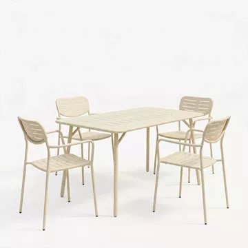 Refresh your outdoor space with a dining set that combines refined aesthetics with excellent ergonomics. The set includes the spacious Moraja table and four comfortable, stackable Deraby armchairs, all in a soft cream shade that brings brightness and a sense of cleanliness to any garden, terrace, or patio.