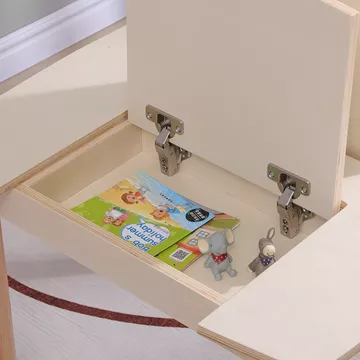 The built-in storage spaces on both sides offer practical organization for books, toys and whatever the kid wants, keeping the space tidy and easily accessible.