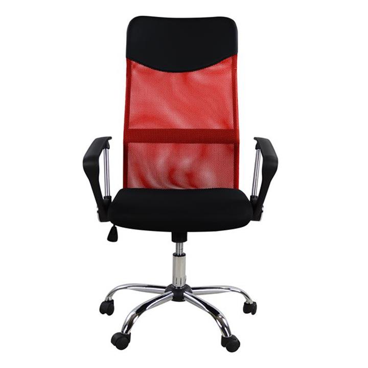 Office chair with arms from black polycarbonate surface, with high back in red color.