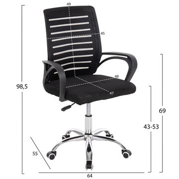 The “TRAIL” office chair in BLACK color with CHROME metal base will fascinate you. It has a mid-height anatomical backrest with a polypropylene frame and mesh fabric, a comfortable seat with mesh fabric, polypropylene arms, and a suspension mechanism with recline adjustment. A proposal that will satisfy the simple user who does not need complex settings on his chair.