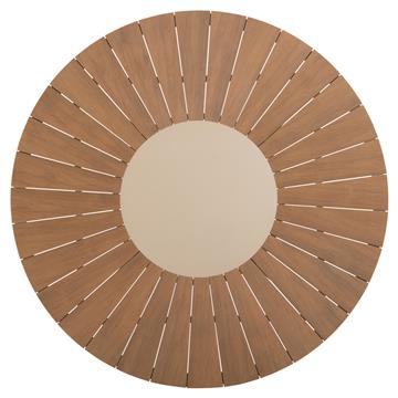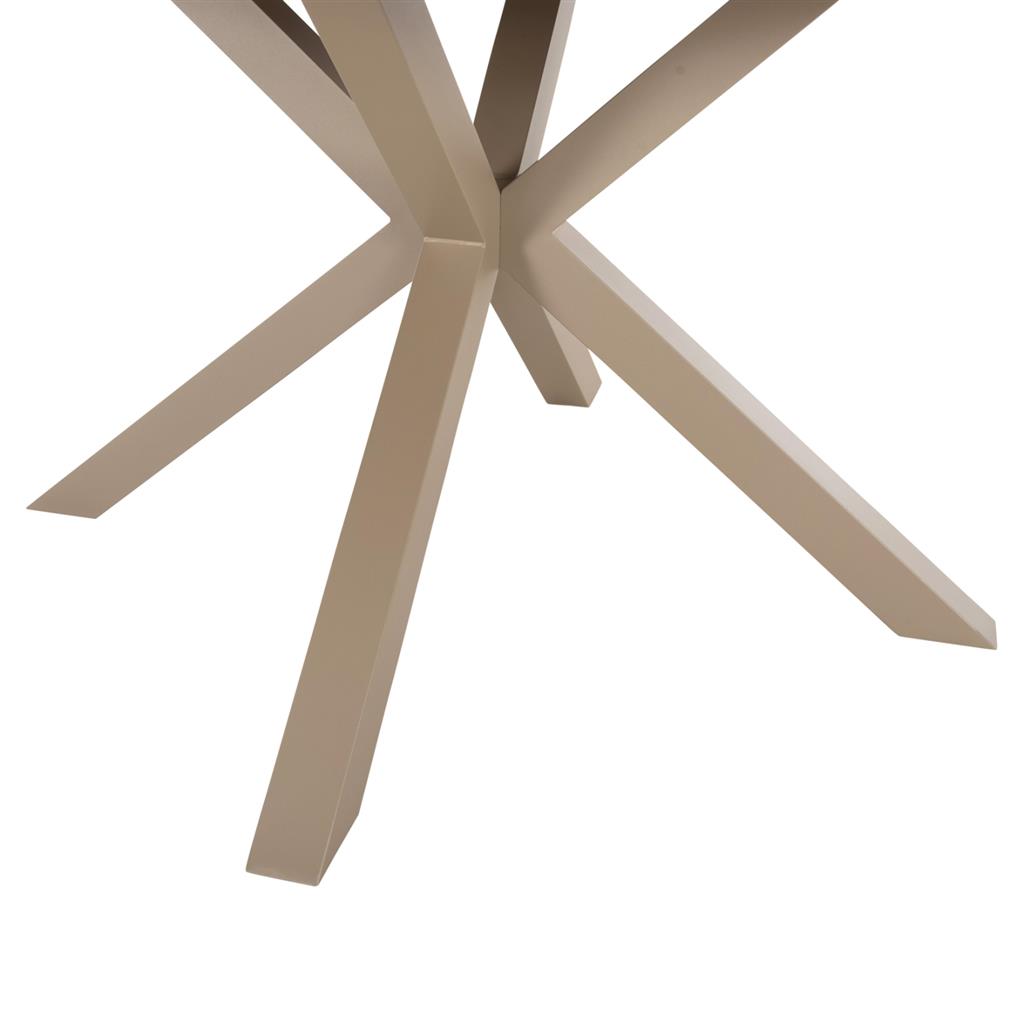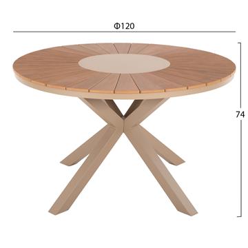 MORIL is a round outdoor table with an aluminum frame in a cross-base arrangement and CHAMPAGNE color. The tabletop is made of polywood plates in NATURAL wood color. It is a beautiful table in normal dimensions, which can serve at least 6 people.