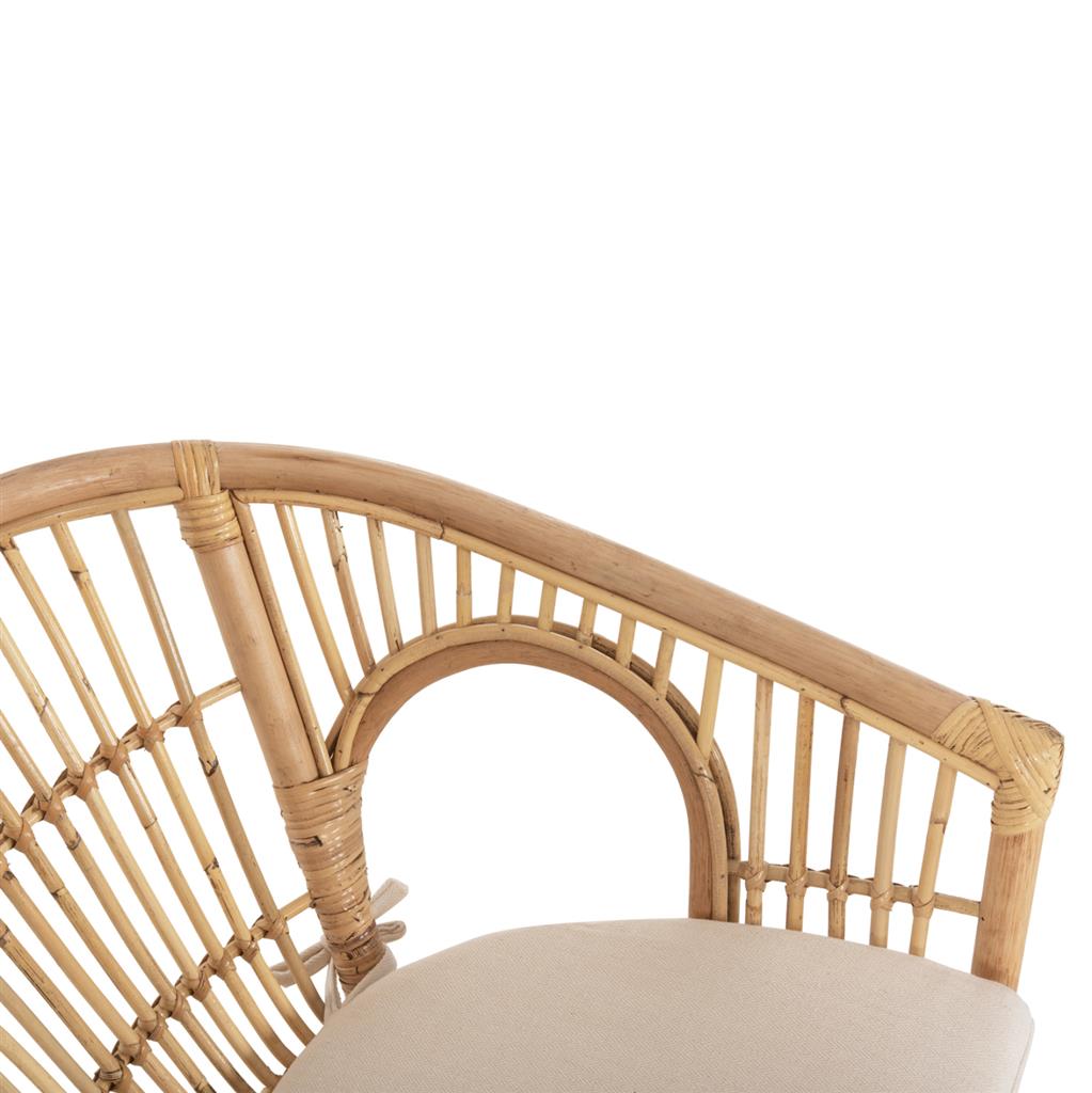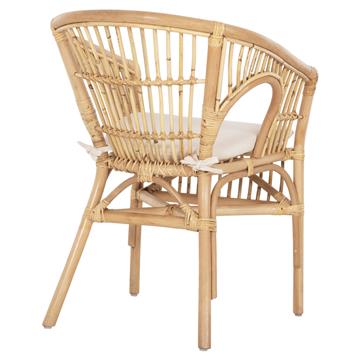 The DAMPAR armchair is mainly for outdoor spaces, and it basically has no separate arms but its design hugs the body. Its frame, like the seat, is made of Rattan in NATURAL color. The cushion on the seat is comfortable and its cover is made of WHITE soft fabric and is tied to the seat with laces.