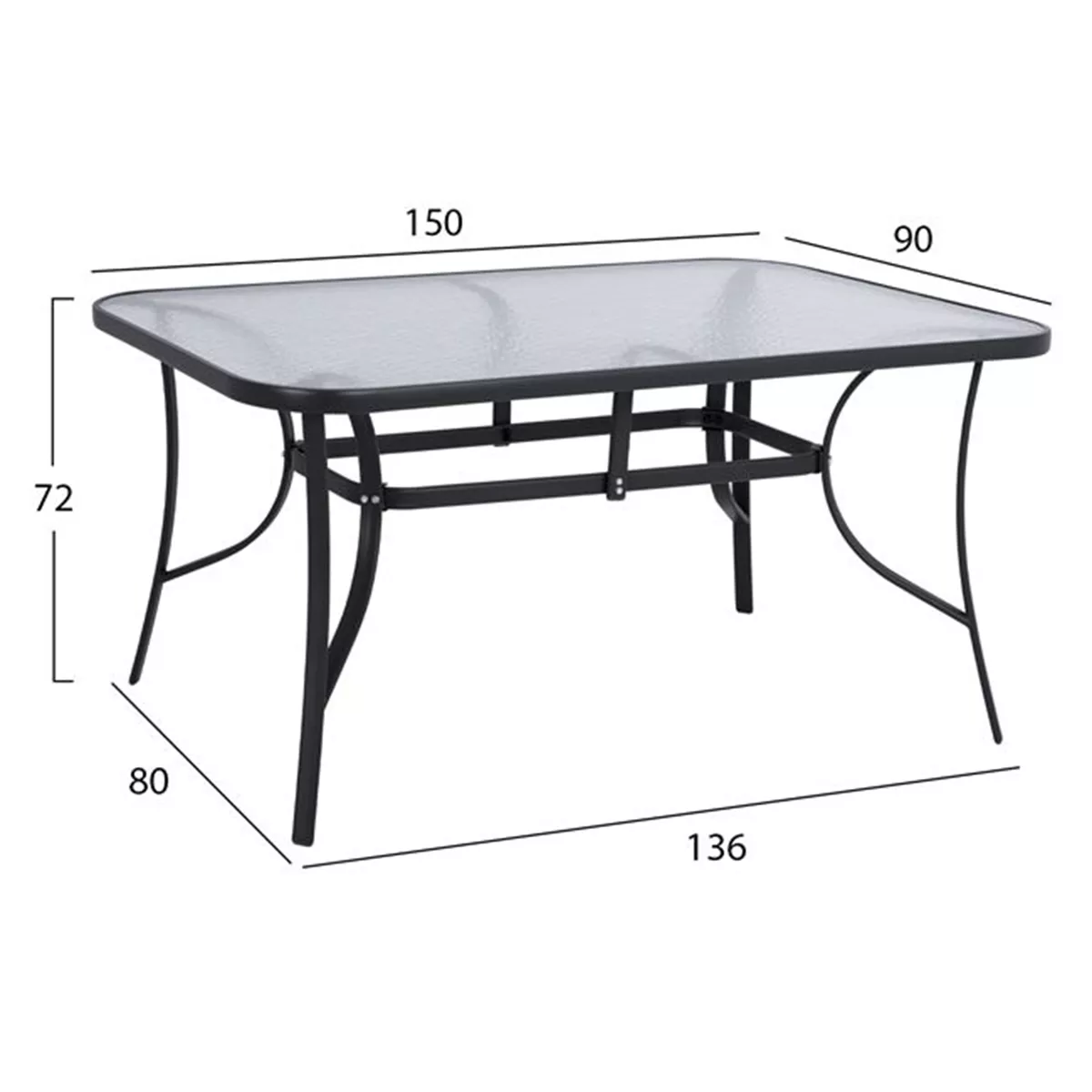 An outdoor metal table in grey-anthracite color, with integrated safety glass (secure).
