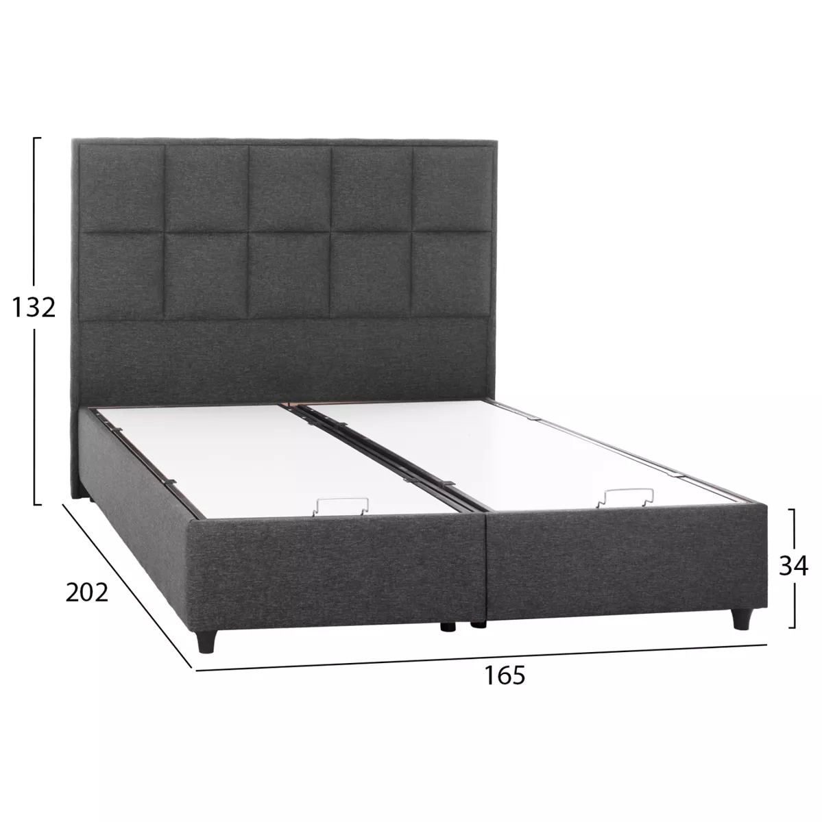 With the ALBA bed you will never ask for anything else. The headboard is high and upholstered with a square-quilted pattern, while the entire bed is upholstered in an excellent textured fabric. The GREY color throughout the bed is striking and can be combined with a variety of decorative patterns. But the main feature of this bed is that it does not follow the classic construction with the slatted slats (mattress boards) to support the mattress, but instead consists of a continuous surface (2 chipboards) on which the mattress rests. In addition, each chipboard surface can be raised with a metal safety mechanism with 4 gas lifts and metal handles, offering a large storage space. In mattress dimensions of 160x200 cm, every dream will fit!