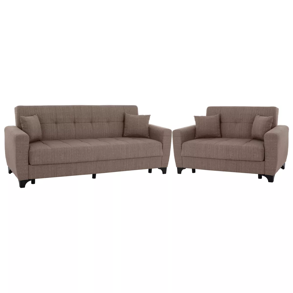 Both are upholstered with BEIGE fabric of excellent quality and have 2 decorative cushions. The armrests are wide enough to offer comfort and support. The upholstery has a quilting style in large squares on both the comfortable seats and the tall backrests of the sofas.