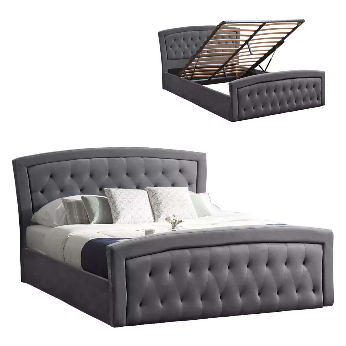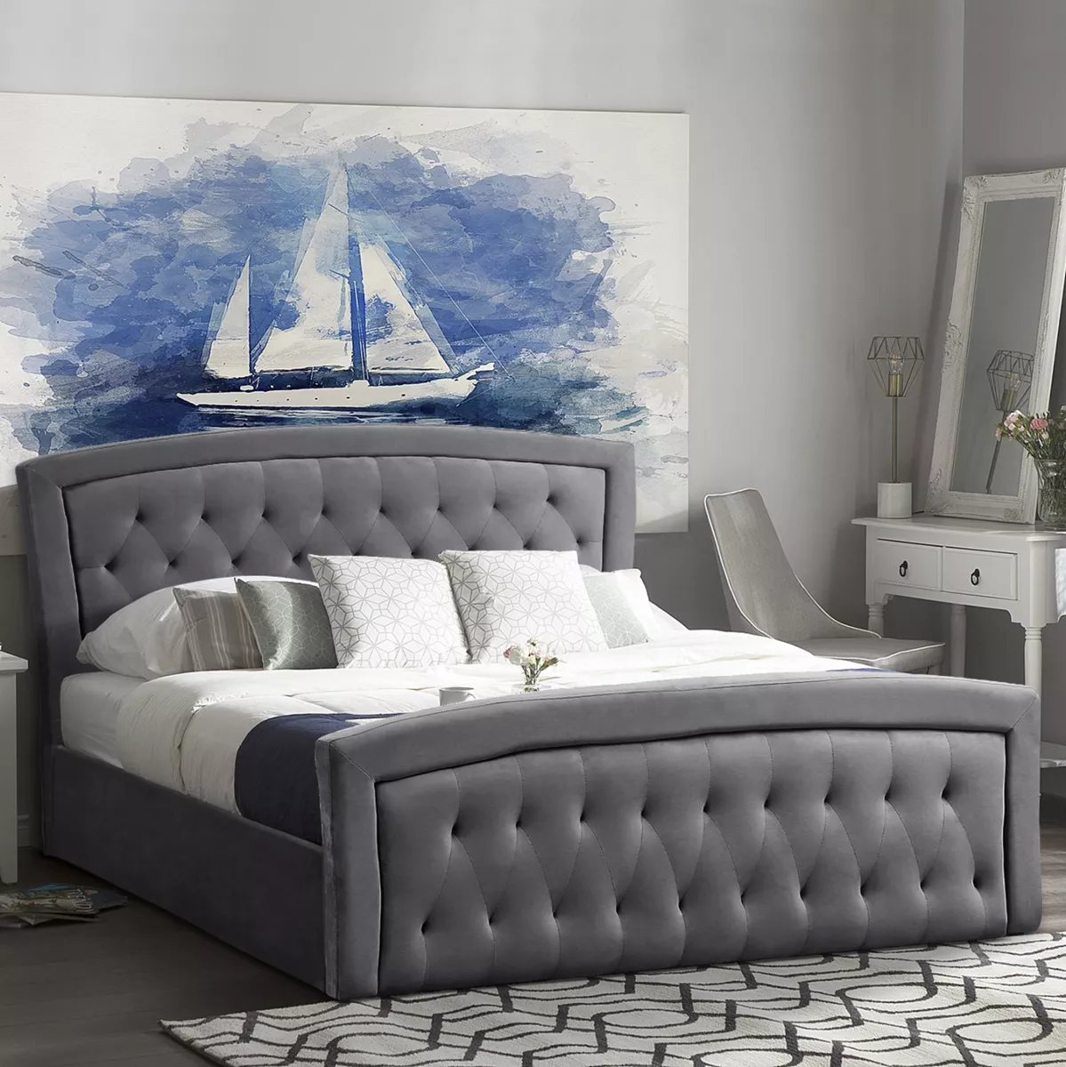 The ODELIA bed is beautiful and its curves on both the headboard and the footboard create a sense of relaxation and floating in your bedroom. The main feature, however, is the lining of the entire bed with grey velvet in a quilted pattern, both on the headboard and on the footboard.