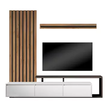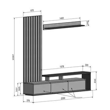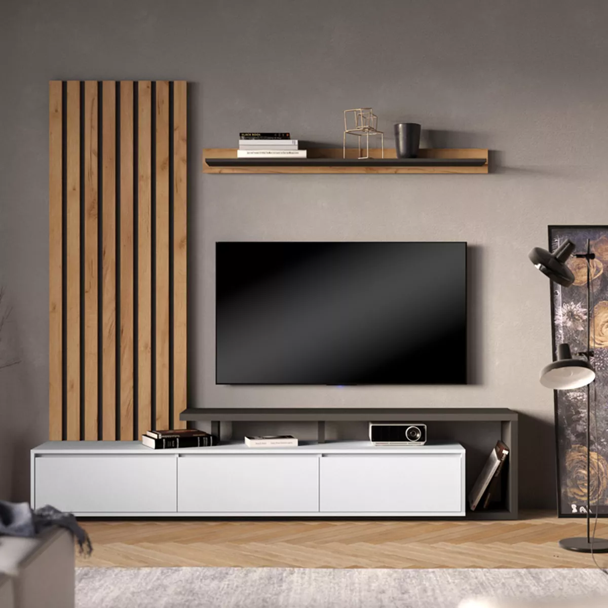 σε φυσική απόχρωση-ανθρακί-ανοιχτό γκρι • Φέρει ράφι για τις ηλεκτρονικές συσκευές καθώς και τρία ντουλάπια για την αποθήκευση μικροαντικειμένων.