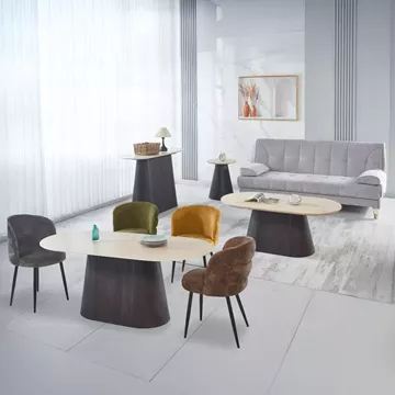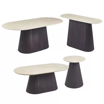 Το σετ 4τμχ CATER θα προσφέρει ομοιομορφία και συμμετρία στον χώρο σας και αποτελείται από δύο τραπεζάκια, ένα σαλονιού σε οβάλ σχήμα κι ένα στρογγυλό βοηθητικό, ένα οβάλ τραπέζι τραπεζαρίας και μια οβάλ κονσόλα, όλα της ίδιας σειράς. Διαθέτουν κεραμικές επιφάνειες σε χρωματισμό ΠΕΤΡΑΣ ΤΡΑΒΕΡΤΙΝΑΣ, και βάσεις από MDF σε ΣΚΟΥΡΟ ΚΑΦΕ χρώμα.