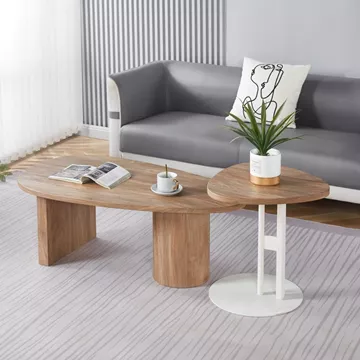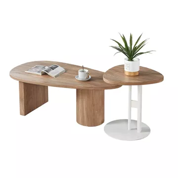 Το σετ ALPER αποτελείται από ένα τραπέζιο σαλονιού και ένα βοηθητικό τραπέζι της ίδιας σειράς. Διαθέτουν επιφάνεια από MDF σε οβάλ σχήμα από MDF σε χρώμα SONAMA, ενώ το βοηθητικό τραπεζάκι διαθέτει κολώνα και βάση μεταλλική σε ΛΕΥΚΟ χρώμα.