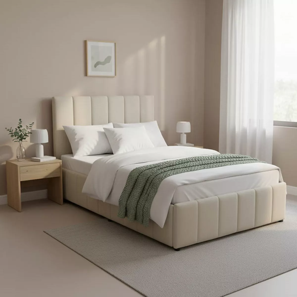 Το κρεβάτι διαθέτει έναν εύχρηστο μηχανισμό ανύψωσης του στρώματος, ο οποίος αποκαλύπτει έναν ευρύχωρο αποθηκευτικό χώρο από κάτω. Αυτό καθιστά εξαιρετικά εύκολη την τακτοποίηση κλινοσκεπασμάτων, μαξιλαριών, ρούχων εκτός εποχής ή άλλων αντικειμένων, συμβάλλοντας αποτελεσματικά στην οργάνωση και την τάξη του χώρου.