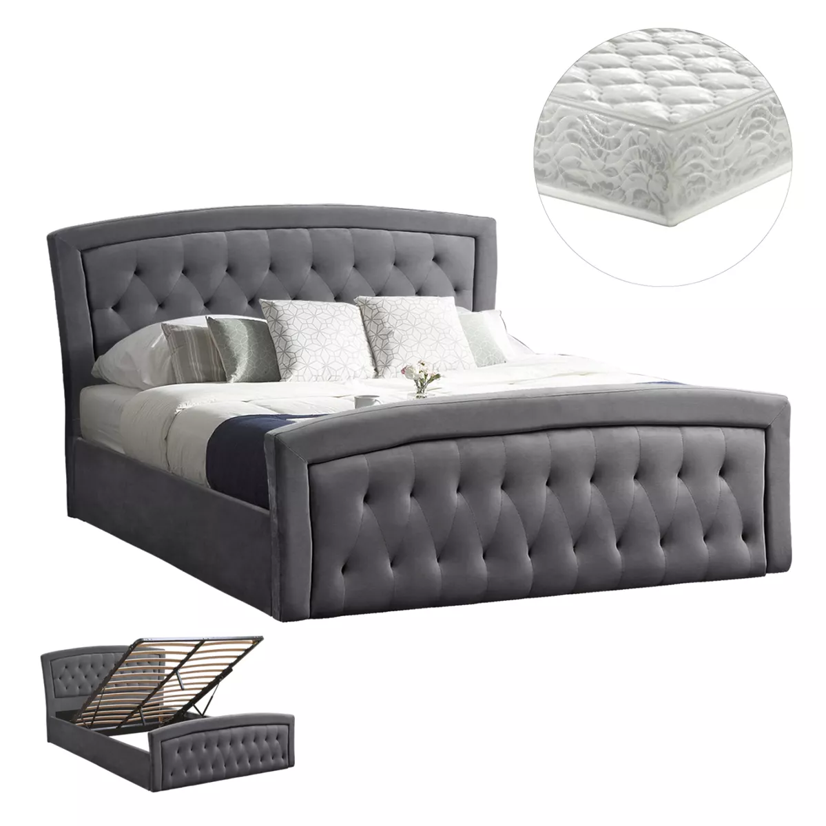 Το υπέρδιπλο κρεβάτι ODELIA είναι επενδυμένο με ΓΚΡΙ βελούδο σε καπιτονέ στυλ. Το στρώμα τοποθετείται σε δύο σειρές ανατομικές τάβλες που ανασηκώνονται με μεταλλικό μηχανισμό ασφαλείας και μεταλλικές λαβές προσφέροντας έναν μεγάλο αποθηκευτικό χώρο.