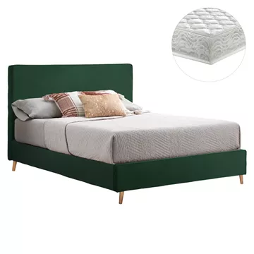 Το υπέρδιπλο κρεβάτι INDRA είναι επενδυμένο με βελούδο σε χρώμα ΚΥΠΑΡΙΣΣΙ με ίδιο ρέλι στις ραφές. Το στρώμα που συνοδεύει το κρεβάτι τοποθετείται σε δύο σειρές ανατομικές τάβλες, είναι διπλής όψης και έχει τεχνολογία με pocket springs (ανεξάρτητα ελατήρια). Τα πόδια είναι ξύλινα σε φυσικό χρώμα.