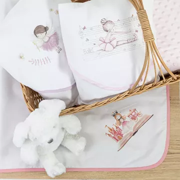 Πάνα αγκαλιάς από ύφασμα πικέ waffle, 160 κλωστών, 100% βαμβακερό, λευκό με ροζ ρέλι περιμετρικά και ψηφιακή εκτύπωση τριών σχεδίων για κορίτσι.