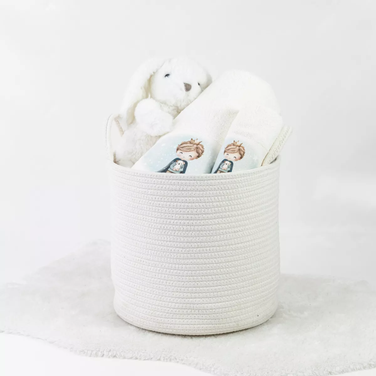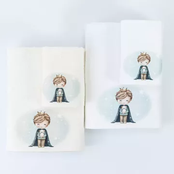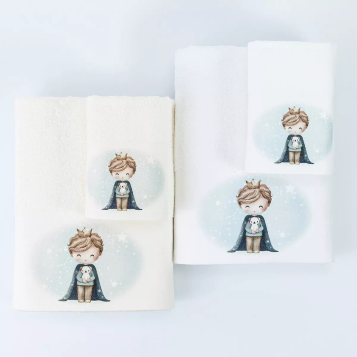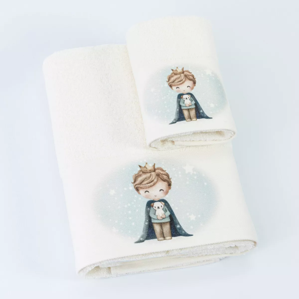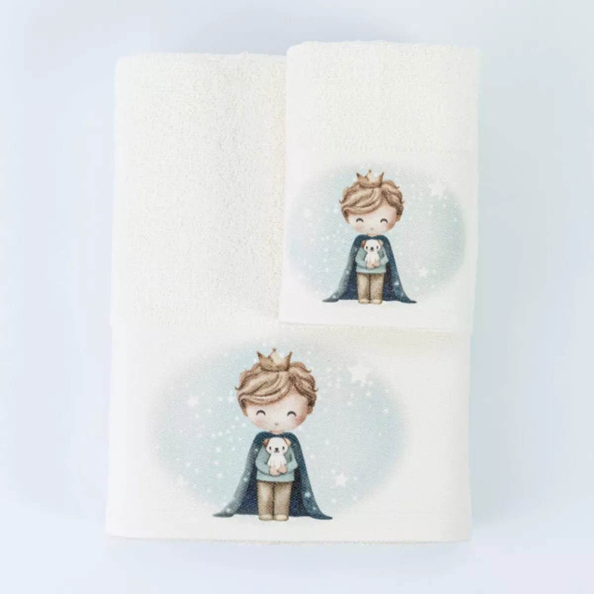 Σετ πετσέτες 2 τεμαχίων, μπάνιου και χειρός, από ύφασμα φροτέ πενιέ, 100% βαμβακερό, μονόχρωμο, εκρού, με ψηφιακή εκτύπωση, σχέδιο πρίγκιπας.Διατίθεται σε 2 χρώματα.
