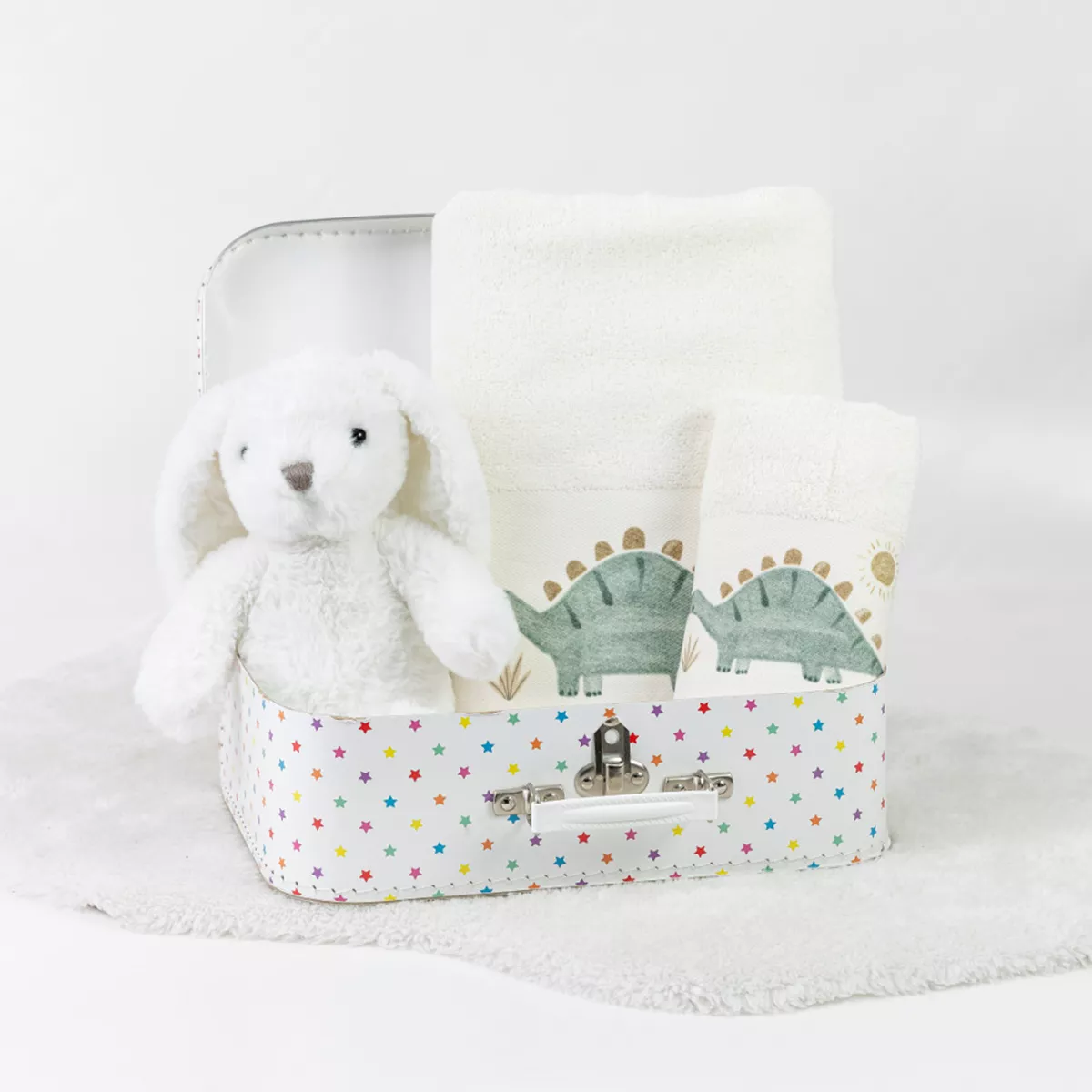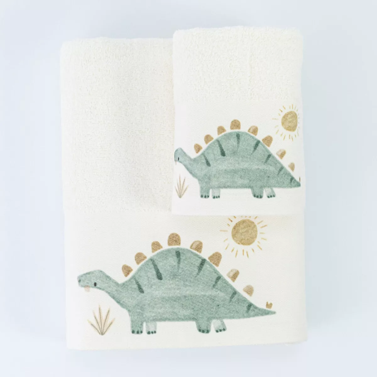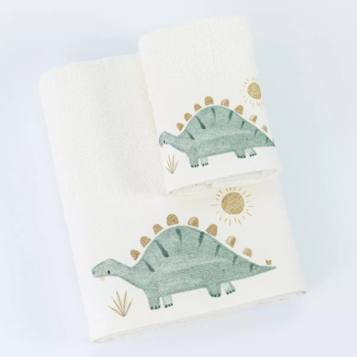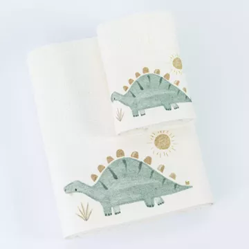 Σετ πετσέτες 2 τεμαχίων, μπάνιου και χειρός, από ύφασμα φροτέ πενιέ, 100% βαμβακερό, μονόχρωμο, εκρού, με ψηφιακή εκτύπωση, σχέδιο δεινόσαυρος.Διατίθεται σε 2 χρώματα.