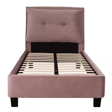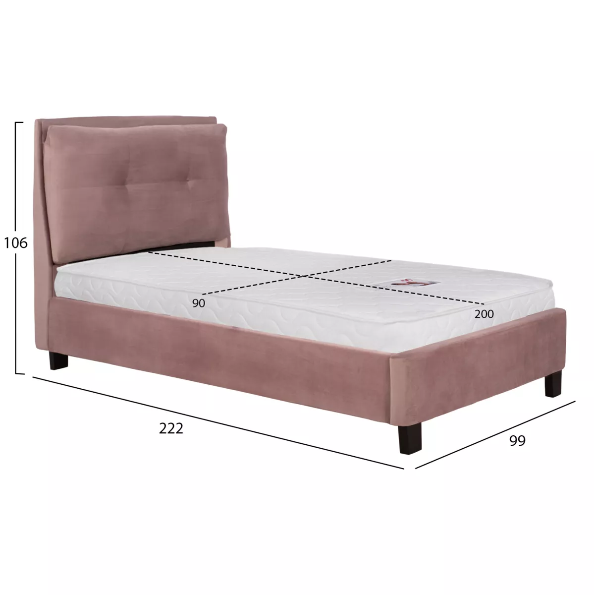 Το μονό κρεβάτι RILEY είναι επενδυμένο με βελούδο σε ΣΑΠΙΟ ΜΗΛΟ χρώμα. Το στρώμα (διατίθεται σε ROLL-PACKING*) που συνοδεύει το κρεβάτι τοποθετείται σε δύο σειρές ανατομικές τάβλες, είναι διπλής όψης και είναι ΑΦΡΟΥ χωρίς ελατήρια. Τα πόδια είναι σχετικά ψηλά από πολυπροπυλένιο σε μαύρο χρώμα.