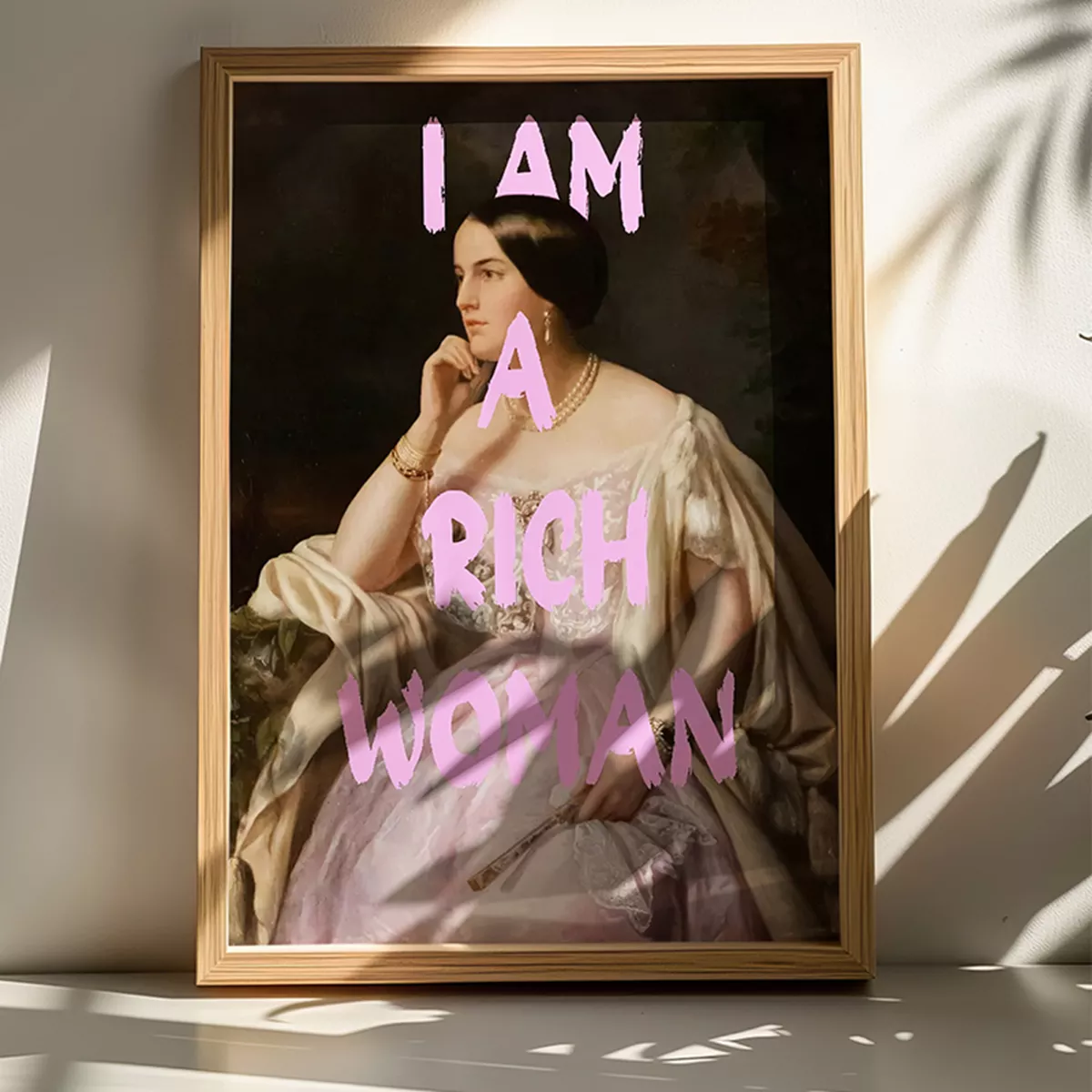 Ο πίνακας Richy είναι ένα εντυπωσιακό και δυναμικό statement piece, ιδανικό για να προσθέσει προσωπικότητα και έμφαση στην αυτοεκτίμηση στον χώρο σας. Συνδυάζει την κλασική τέχνη με το μοντέρνο street art, καθώς το σύνθημα "I AM A RICH WOMAN" (Είμαι μια πλούσια γυναίκα) εμφανίζεται σε έντονα, ροζ γράμματα πάνω σε έναν κλασικό πίνακα με γυναίκα σε vintage ενδυμασία. Η φράση είναι ένα ισχυρό μήνυμα για την αυτοαποδοχή και την ενδυνάμωση, καθιστώντας τον πίνακα ιδανικό για ένα δωμάτιο όπου χρειάζεται έμπνευση και αυτοπεποίθηση. Η αντίθεση μεταξύ του κλασικού φόντου και του σύγχρονου, τολμηρού μηνύματος δημιουργεί ένα έργο με μοναδικό χαρακτήρα.