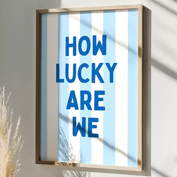 Εκφράστε την ευγνωμοσύνη και τη θετική σας διάθεση με τον αισιόδοξο πίνακα Luckely. Ο πίνακας αυτός φέρει το ελπιδοφόρο μήνυμα "HOW LUCKY ARE WE" με έντονα μπλε γράμματα. Το φόντο με τις γαλάζιες και λευκές ρίγες δημιουργεί μια αίσθηση ηρεμίας και χαράς, καθιστώντας τον ιδανικό για κάθε χώρο που χρειάζεται μια δόση έμπνευσης.