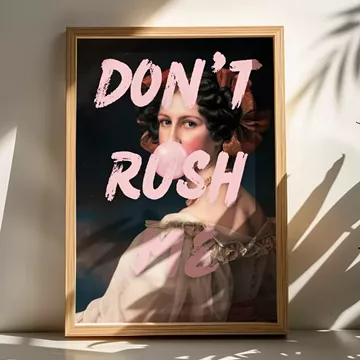 Κάντε μια τολμηρή δήλωση ενάντια στους γρήγορους ρυθμούς της ζωής με τον ανατρεπτικό πίνακα Rushea. Αυτό το έργο τέχνης συνδυάζει ένα κλασικό πορτρέτο γυναίκας (με τσίχλα bubblegum) με ένα ισχυρό, Pop-Art μήνυμα: "DON'T RUSH" (Μην βιάζεσαι), γραμμένο με έντονα ροζ γράμματα. Είναι το τέλειο statement piece για να προσθέσετε χιούμορ, αυτοπεποίθηση και σύγχρονο στυλ στον χώρο σας.