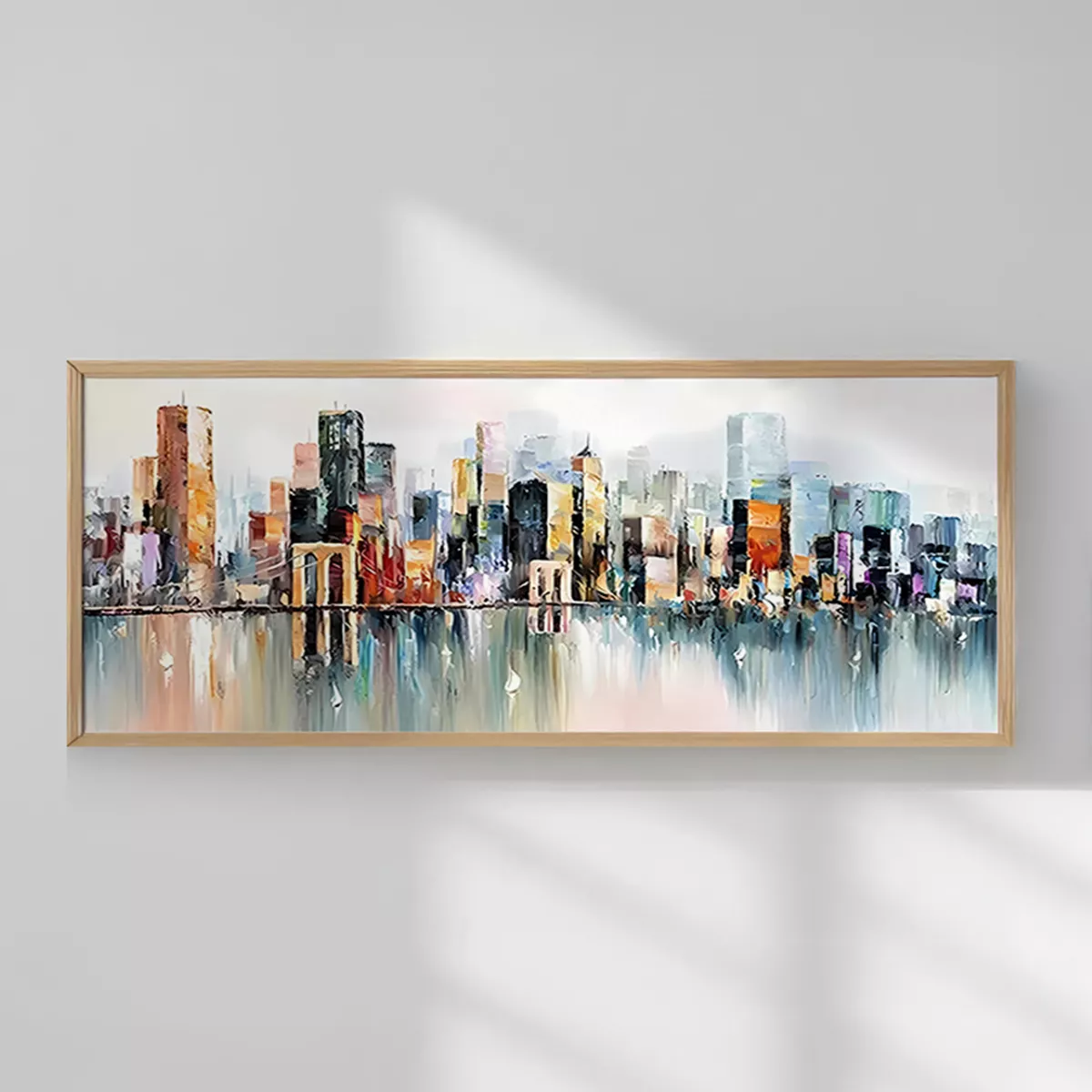 Ανακαλύψτε αυτόν τον εντυπωσιακό, πανοραμικό πίνακα Teria που αποτυπώνει ένα αφηρημένο αστικό τοπίο. Η εκτύπωση μιμείται την αισθητική της ελαιογραφίας με χοντρές, γεμάτες χρώμα πινελιές, οι οποίες αντικατοπτρίζονται στο νερό από κάτω.