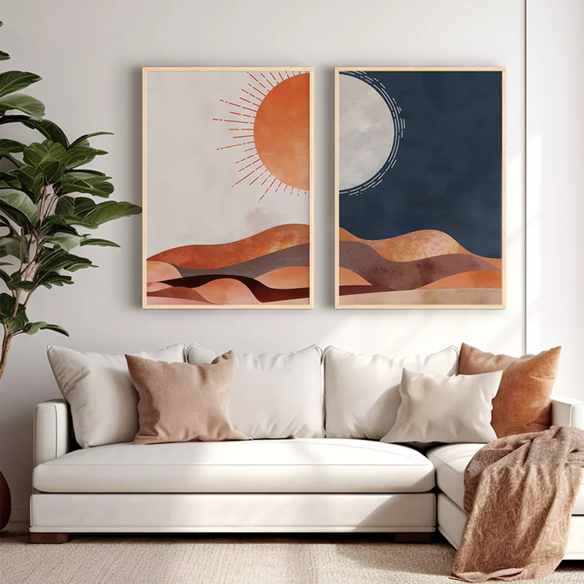 Αφήστε τη ζεστασιά των γήινων τόνων και την αρχέγονη γαλήνη της ερήμου να γεμίσει τον χώρο σας. Το δίπτυχο Lebrano δεν είναι απλώς διακόσμηση, είναι μία αισθητική δήλωση που αναπαριστά τους κύκλους της φύσης (ήλιος/φεγγάρι, μέρα/νύχτα) πάνω από ένα minimal, αφηρημένο τοπίο αμμόλοφων. Κάθε φορά που το βλέμμα σας εστιάζει στους ζεστούς, κεραμιδί-πορτοκαλί τόνους και το βαθύ μπλε, νιώθετε μια αίσθηση ισορροπίας, πνευματικής ηρεμίας και τροπικής πολυτέλειας. Το έργο συμβολίζει τον αιώνιο κύκλο, τη σταθερότητα και τη διακριτική γοητεία του μοντέρνου Bohemian στυλ.