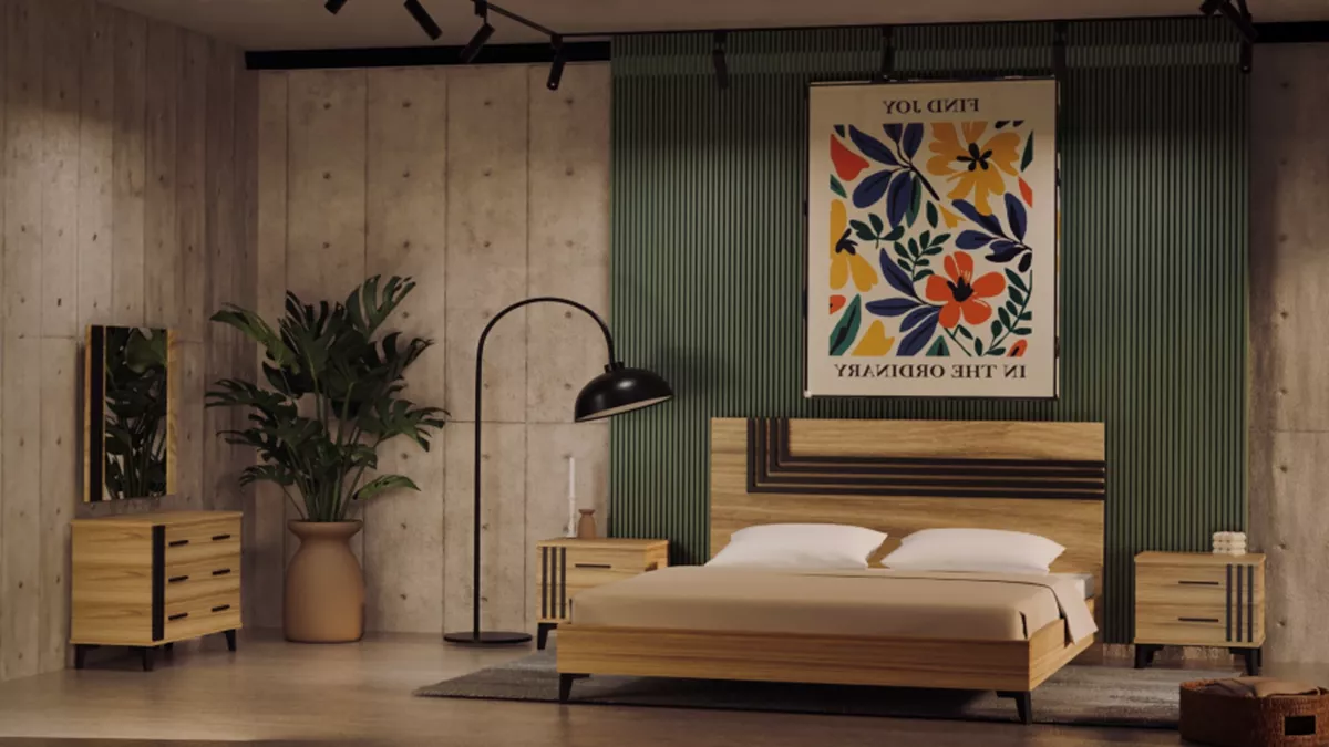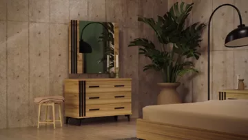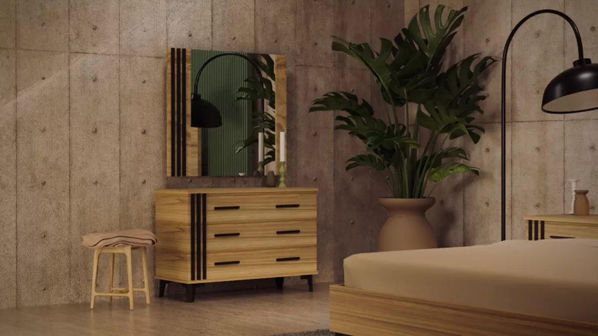 Το σετ υπνοδωματίου “Melody” περιλαμβάνει ένα κρεβάτι “Melody” σε διαστάσεις 160x200 με μεταλλικό ποδαρικό, δύο κομοδίνα, μια συρταριέρα (τουαλέτα) και έναν καθρέπτη.